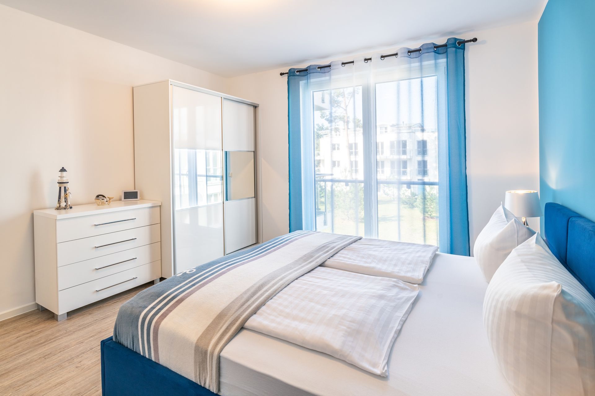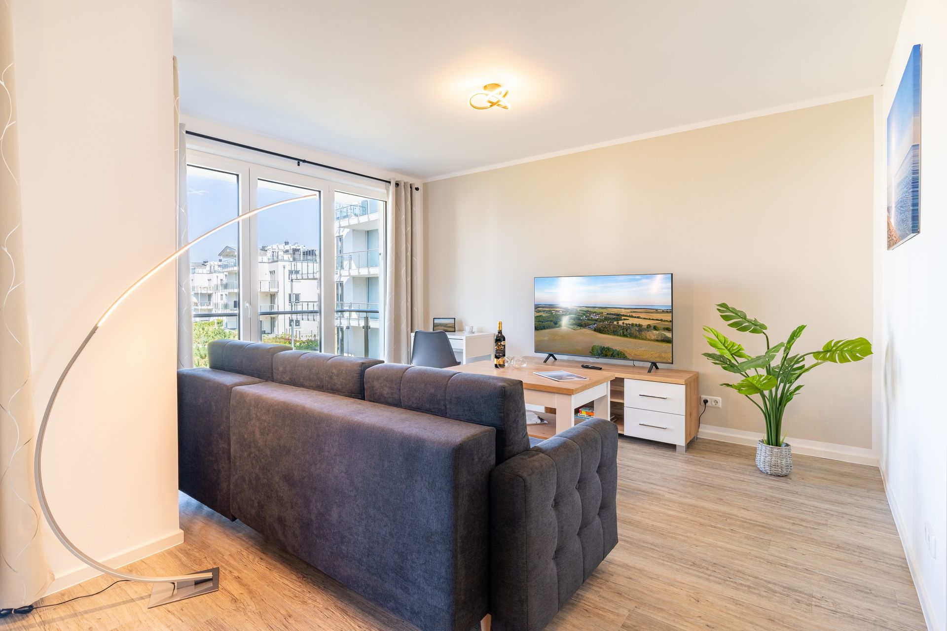 Auf einer Wohnfläche von 70 m² finden drei Erwachsene und ein Kleinkind bis zwei Jahre (im Babybett) in dieser modern eingerichteten Ferienwohnung ausreichend Platz für einen entspannten Urlaub am Stettiner Haff auf Usedom.