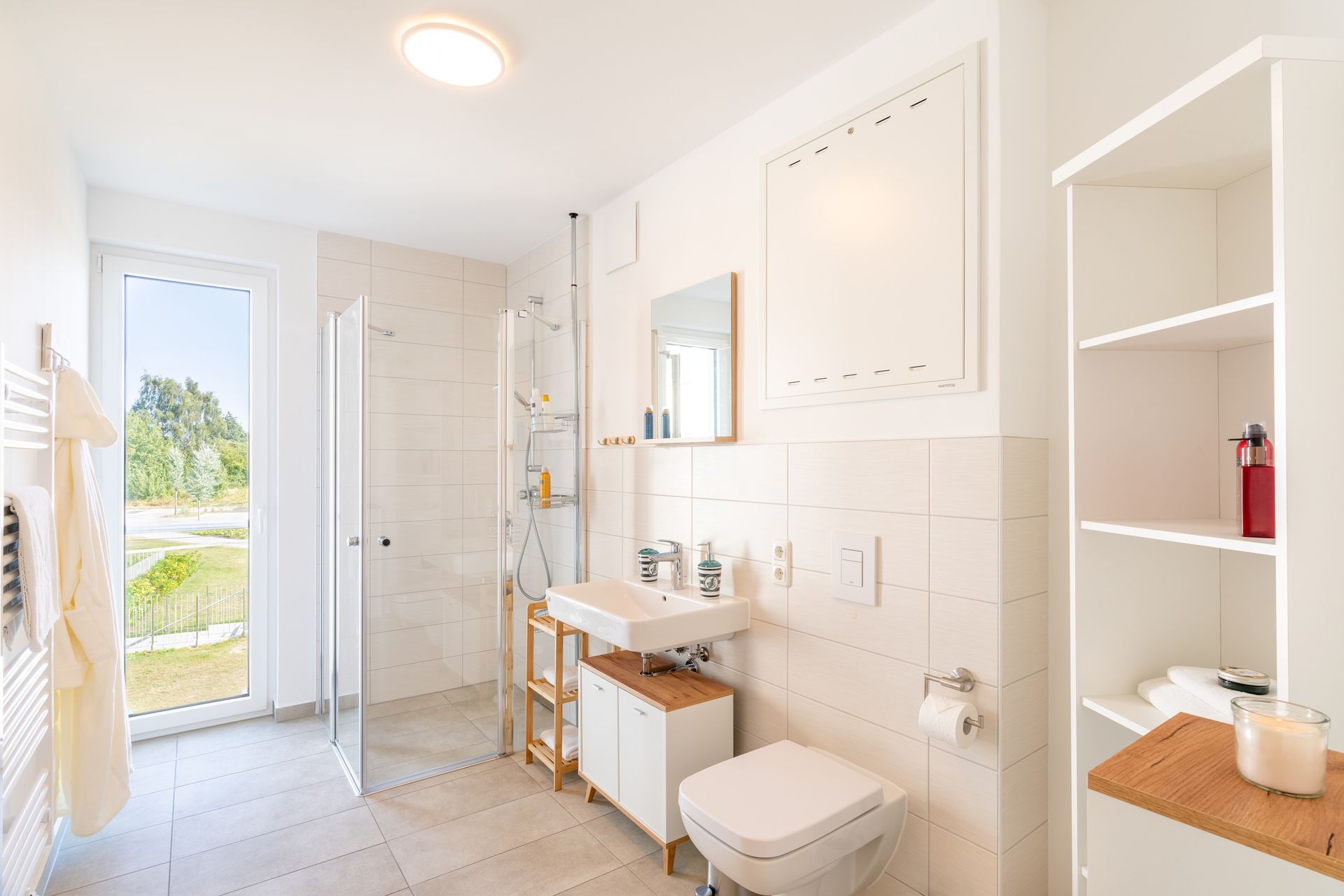 Das vollausgestattete Badezimmer verfügt über eine ebenerdige Dusche, WC, Waschtischanlage sowie Fön.