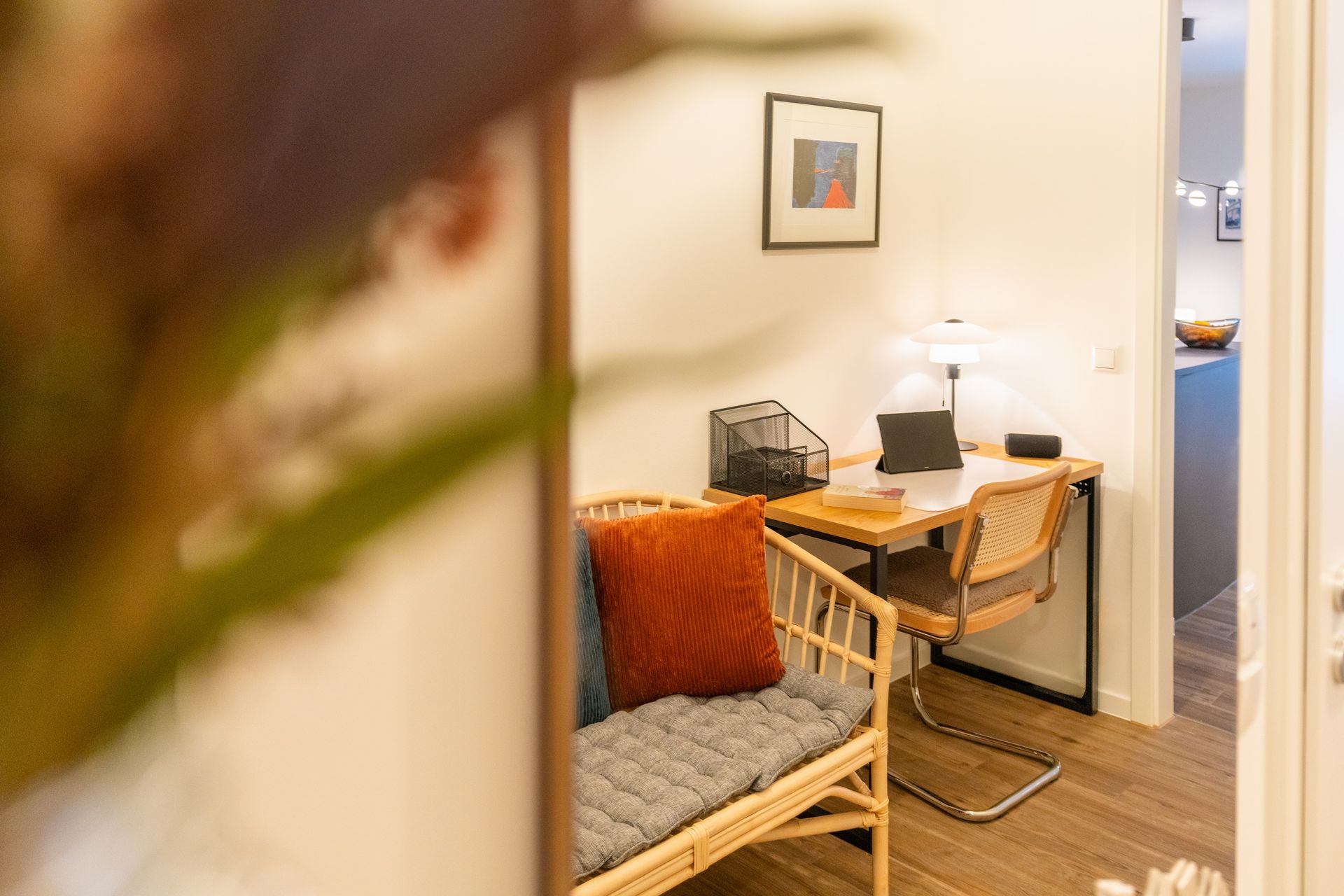 In einer einladenden Ecke im geräumigen Eingangsbereich des Apartments findet sich ein stilvoller Schreibtisch, der als Arbeitsbereich fungiert.