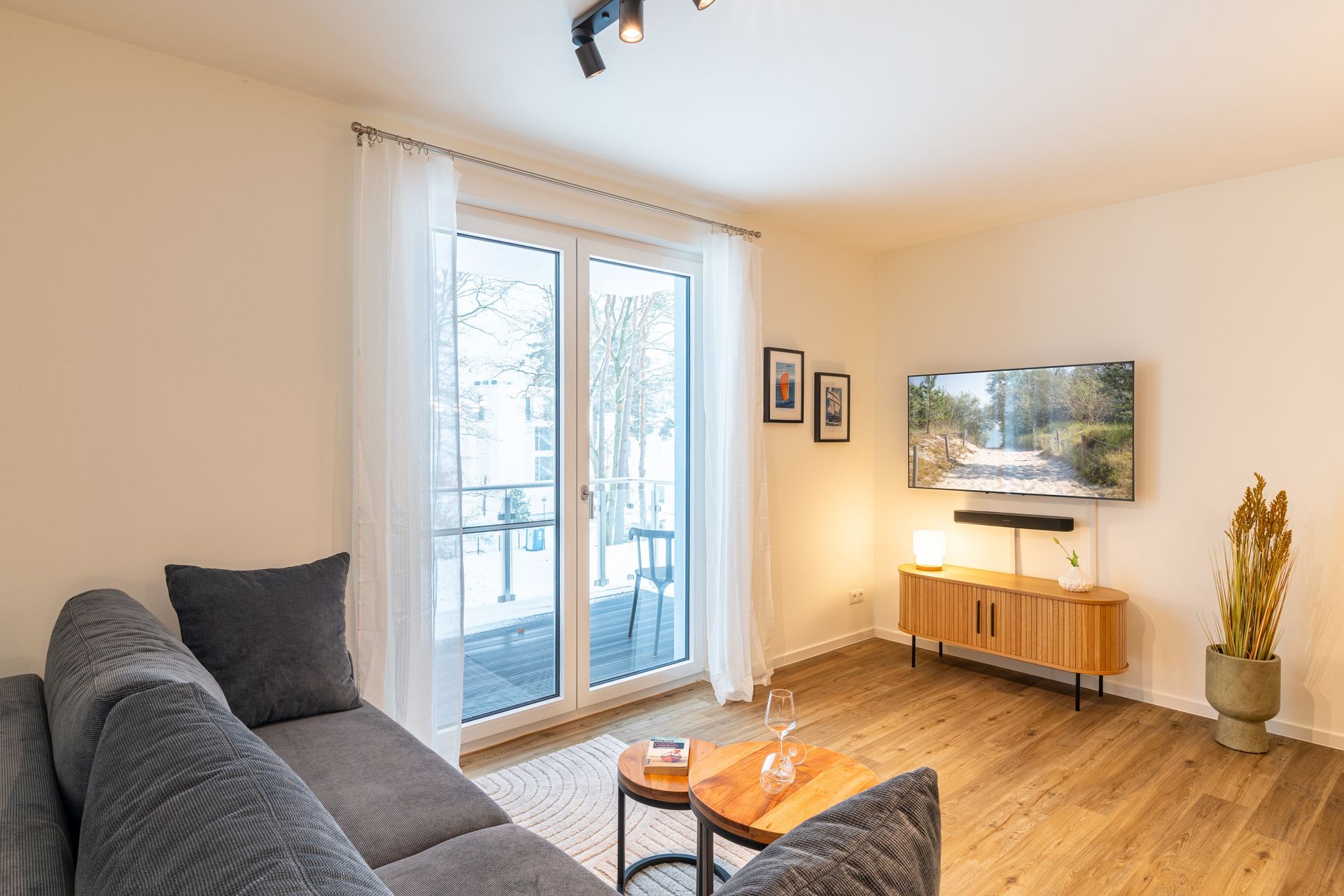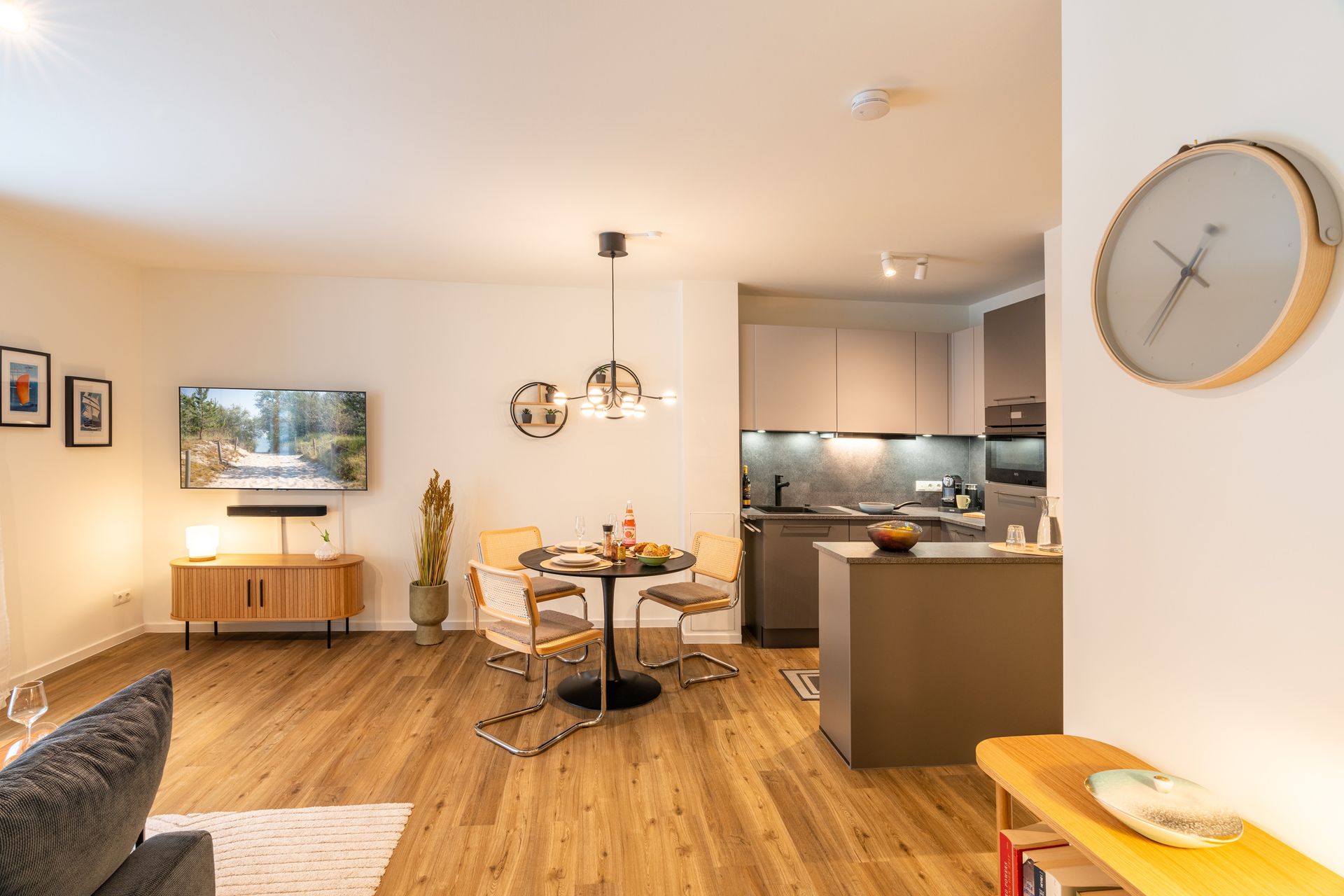 Auf einer Wohnfläche von 61 m² finden drei Erwachsene und ein Kind bis 14 Jahre in dieser modern eingerichteten Ferienwohnung ausreichend Platz für einen entspannten Urlaub am Stettiner Haff auf Usedom.