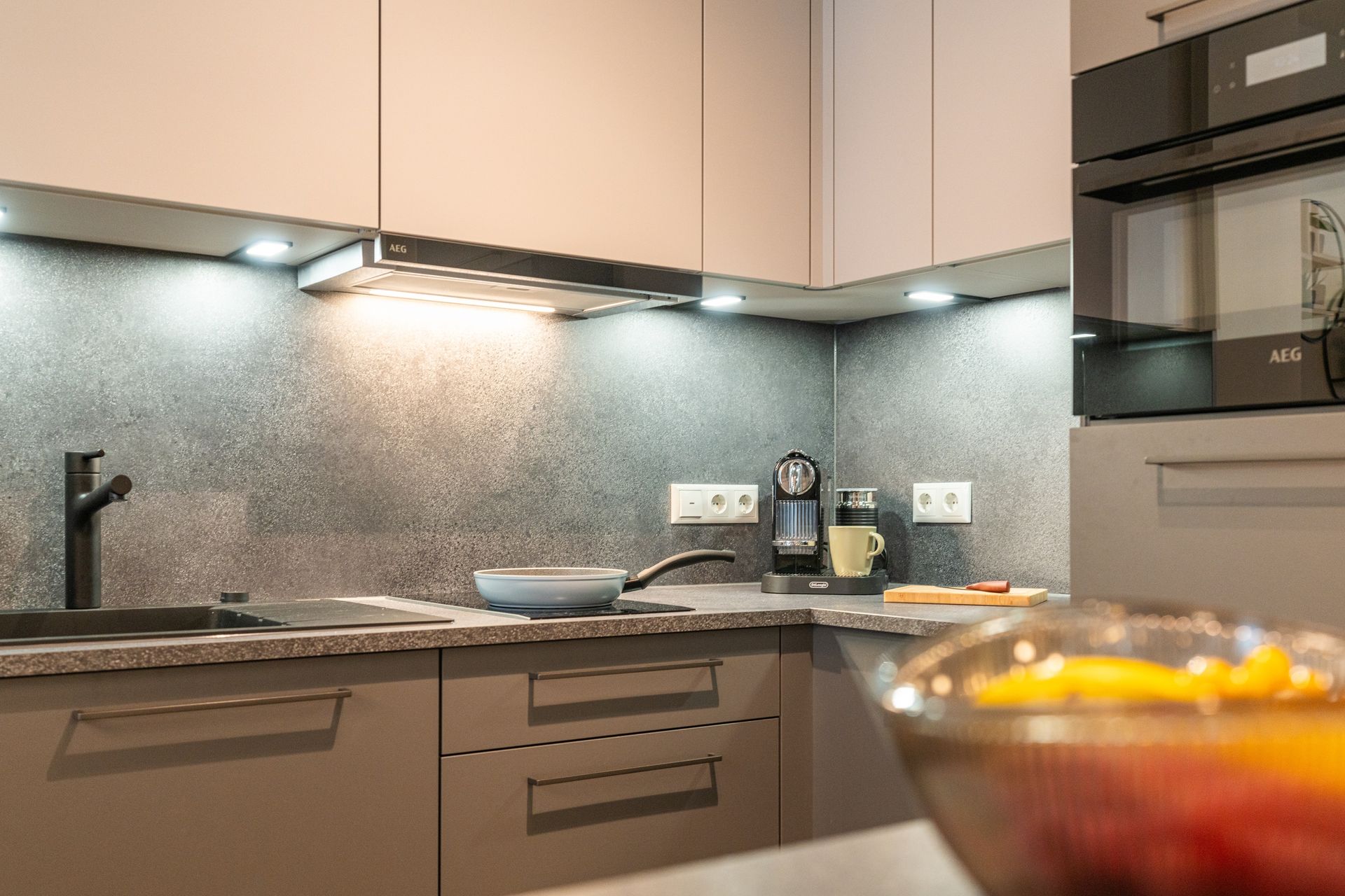 Die Küchenzeile verfügt über hochwertige Geräte wie Herd, Backofen mit integrierter Mikrowelle, 2-Platten-Induktionskochfeld, Kaffeefiltermaschine, Kühlschrank mit Gefrierfach, Nespressomaschine mit Milchaufschäumer sowie Spülmaschine. Ausreichend Geschirr, Besteck sowie Töpfe und Pfannen befinden sich in den Schränken. Am Esstisch finden Sie vor einem erholsamen Urlaubstag zu einem gemeinsamen Frühstück zusammen.