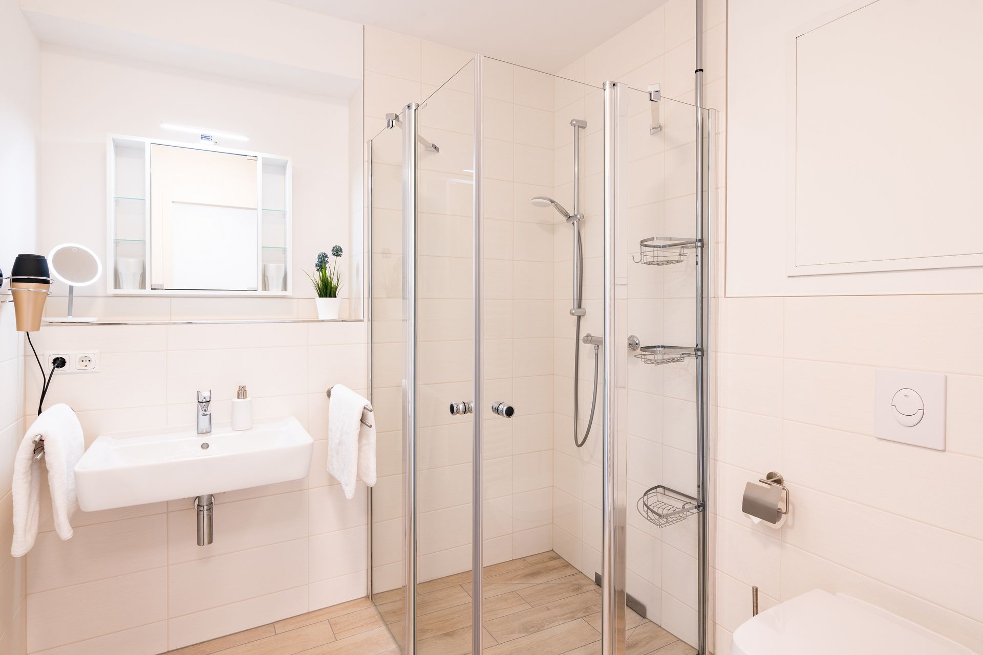 Das vollausgestattete Badezimmer verfügt über eine ebenerdige Dusche, WC, Waschtischanlage sowie Fön. Ein Marken-Waschtrockner zur kostenfreien Nutzung komplettiert die Ferienunterkunft.