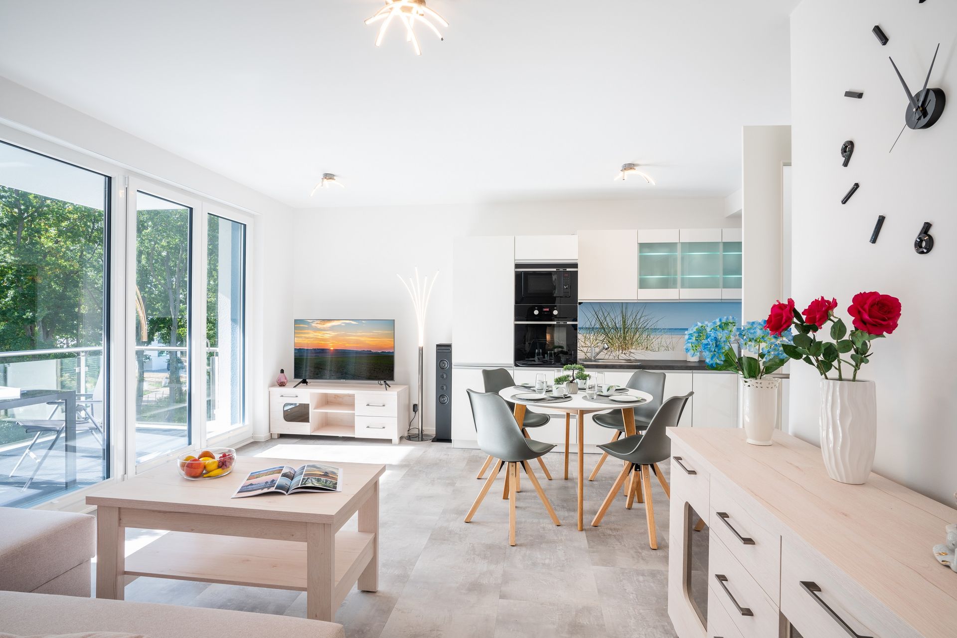Auf einer Wohnfläche von 65 m² finden drei Erwachsene und ein Kleinkind bis zwei Jahre (im Babybett) in dieser modern eingerichteten Ferienwohnung ausreichend Platz für einen entspannten Urlaub am Stettiner Haff auf Usedom.