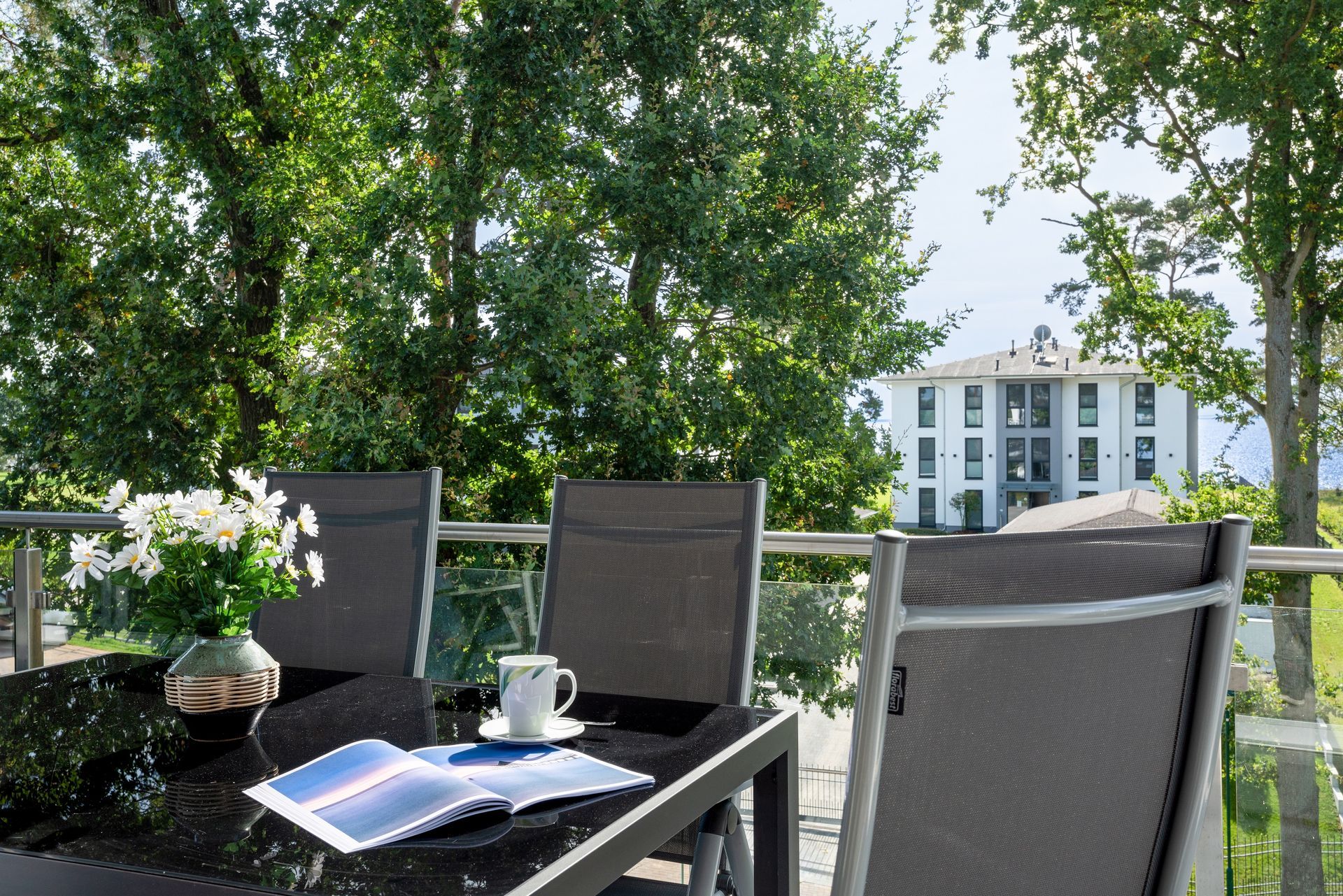 Der Südbalkon mit Sitzgelegenheiten und Sonnenliege ist ein angenehmer Ort, um sich zu entspannen, frische Luft zu schnappen und die Sonne bei einem Sommergetränk zu genießen.