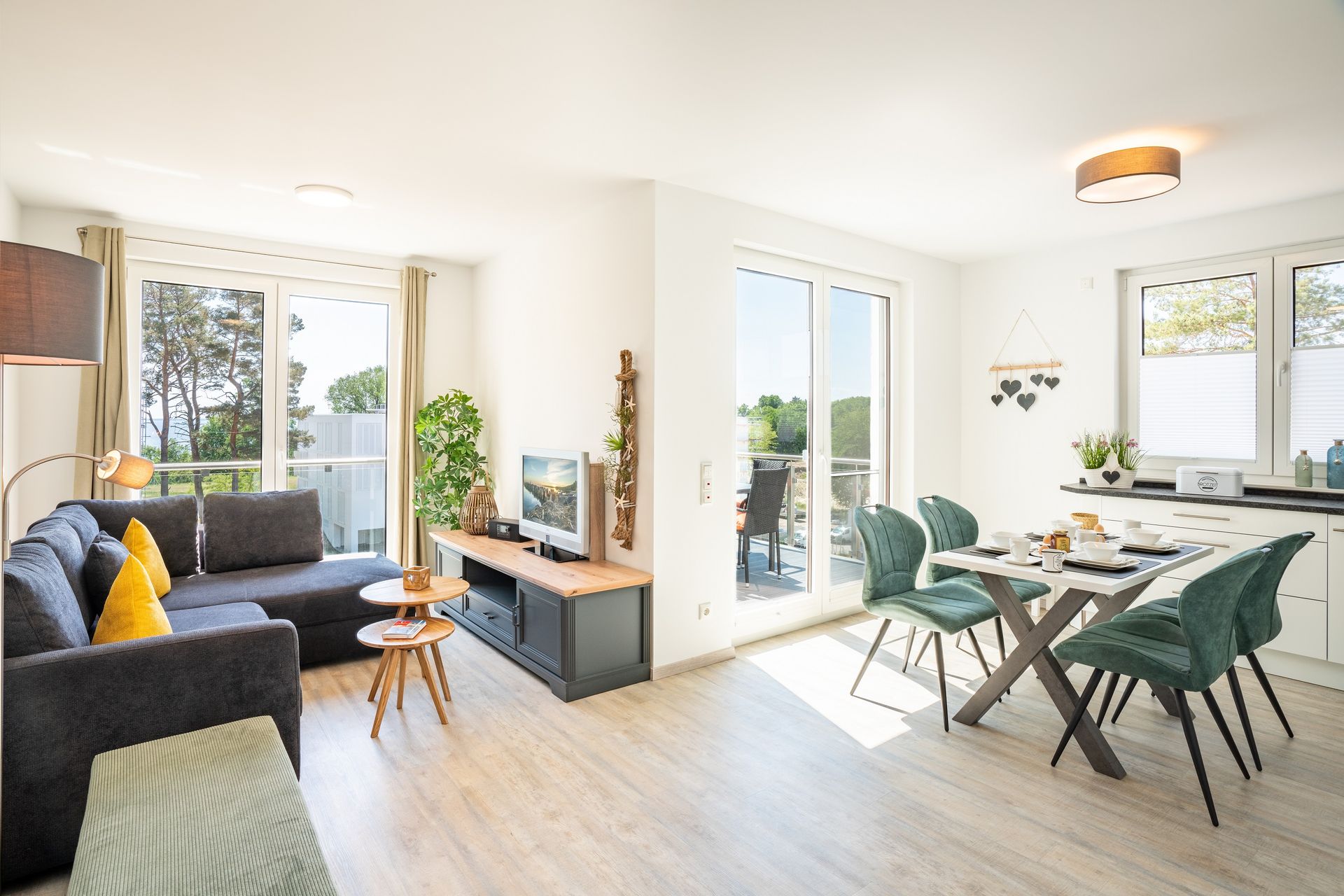 Auf einer Wohnfläche von 61 m² finden drei Erwachsene und ein Kleinkind bis zwei Jahre (im Babybett) in dieser modern eingerichteten Ferienwohnung ausreichend Platz für einen entspannten Urlaub am Stettiner Haff auf Usedom.