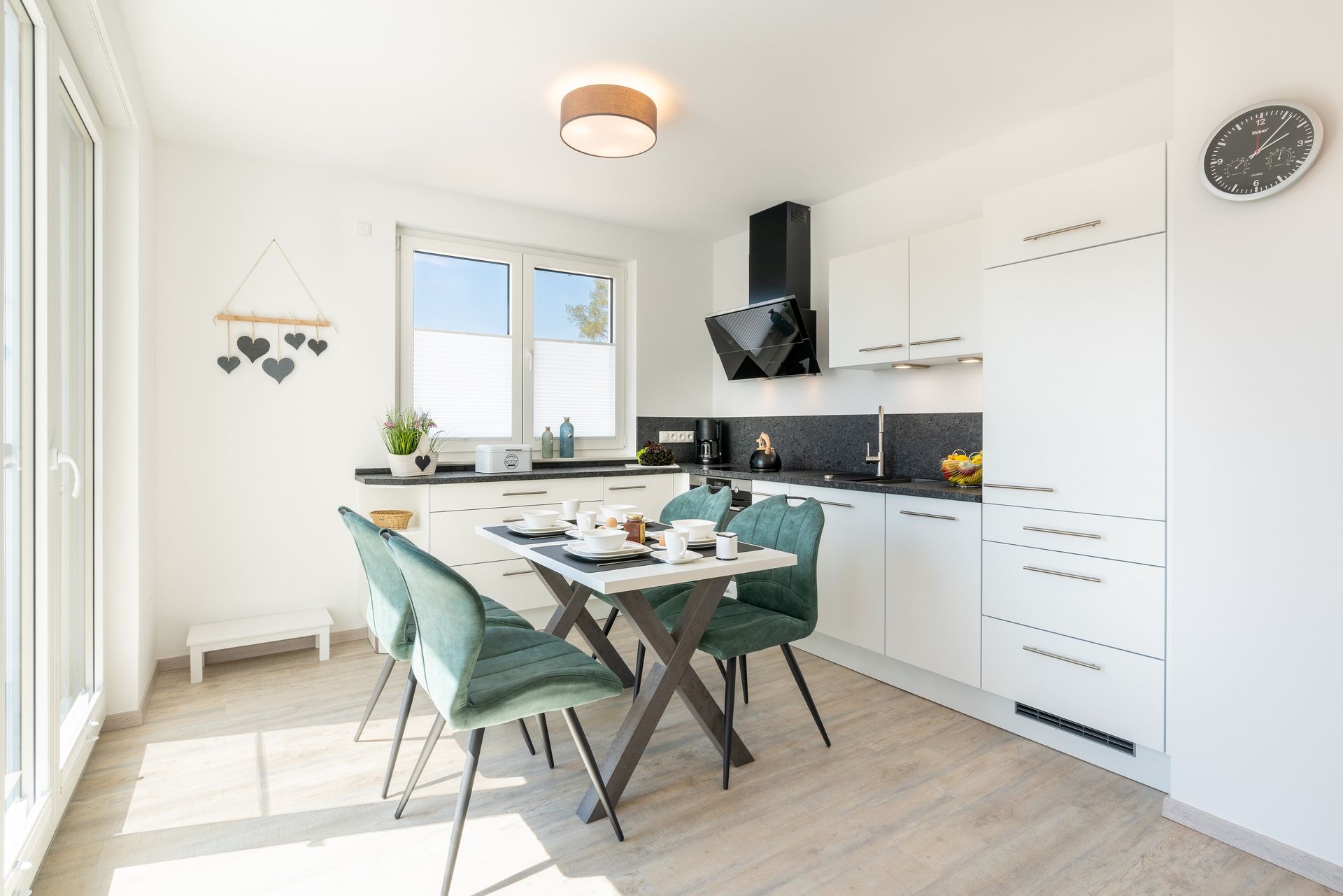 Die Küchenzeile verfügt über hochwertige Geräte wie Herd, Kaffeemaschine, Backofen, Kühlschrank mit Gefrierfach sowie Spülmaschine. Ausreichend Geschirr, Besteck sowie Töpfe und Pfannen befinden sich in den Schränken. Am Esstisch finden Sie vor einem erholsamen Urlaubstag zu einem gemeinsamen Frühstück zusammen.