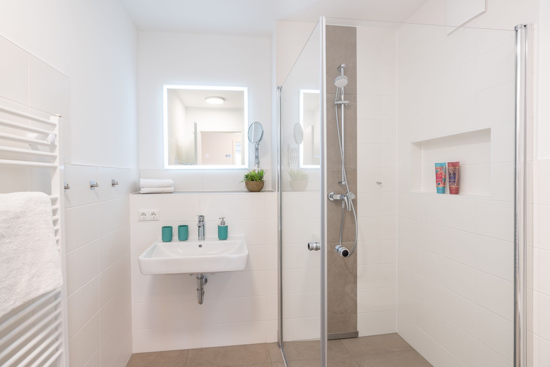 Das vollausgestattete Badezimmer verfügt über eine ebenerdige Dusche, WC, Waschtischanlage sowie Fön.