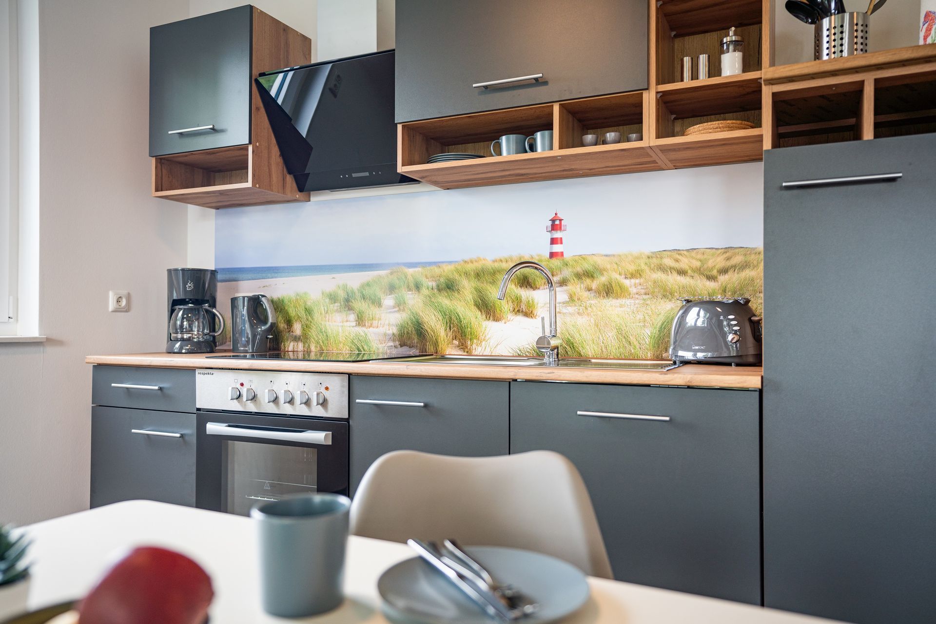 Die Küchenzeile verfügt über hochwertige Geräte wie Herd, Kaffeemaschine, Backofen, Eierkocher, Kühlschrank mit Gefrierfach sowie Spülmaschine. Ausreichend Geschirr, Besteck sowie Töpfe und Pfannen befinden sich in den Schränken. Am Esstisch finden Sie vor einem erholsamen Urlaubstag zu einem gemeinsamen Frühstück zusammen.