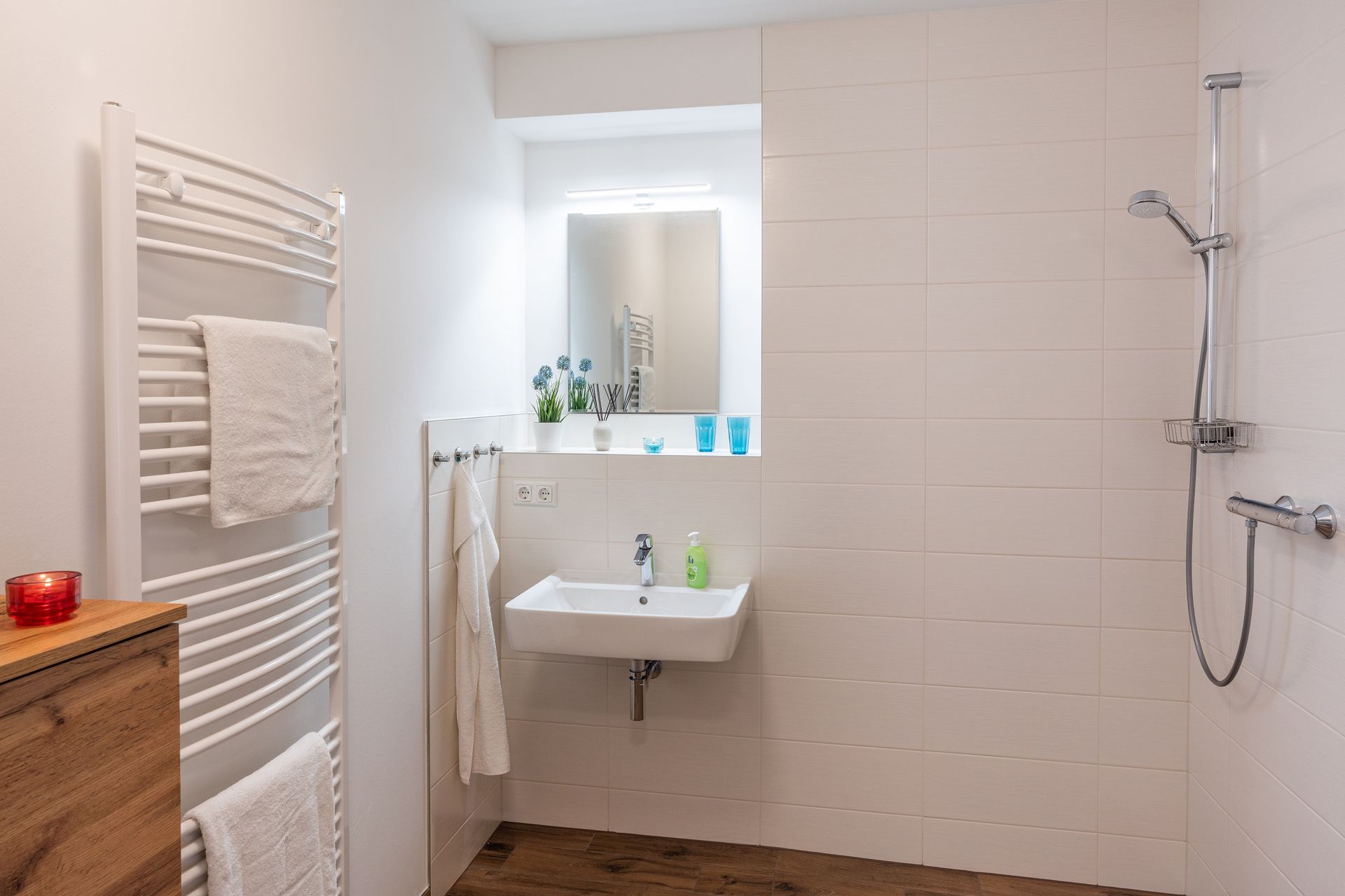Das vollausgestattete Badezimmer verfügt über eine ebenerdige Dusche, WC, Waschtischanlage sowie Fön.