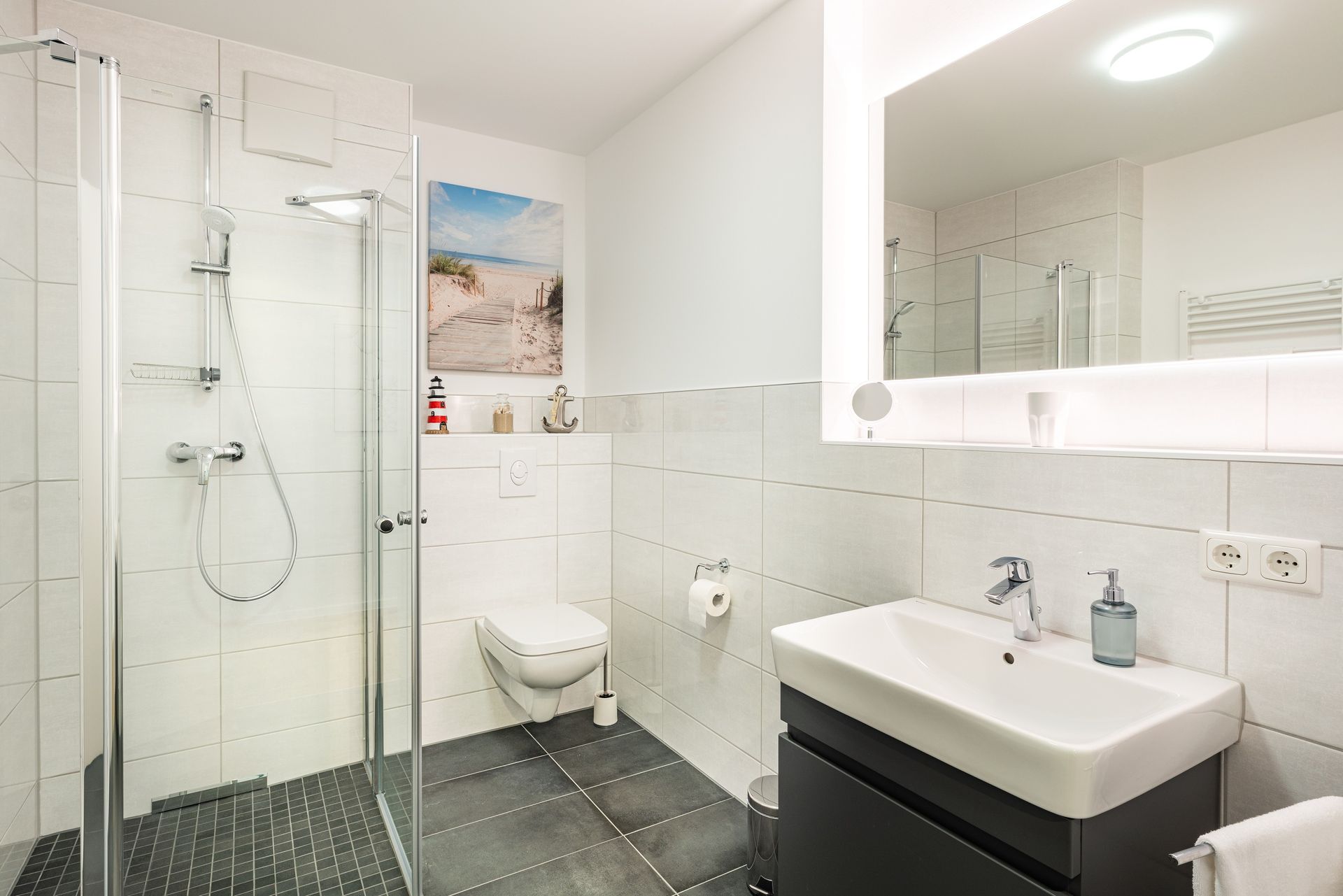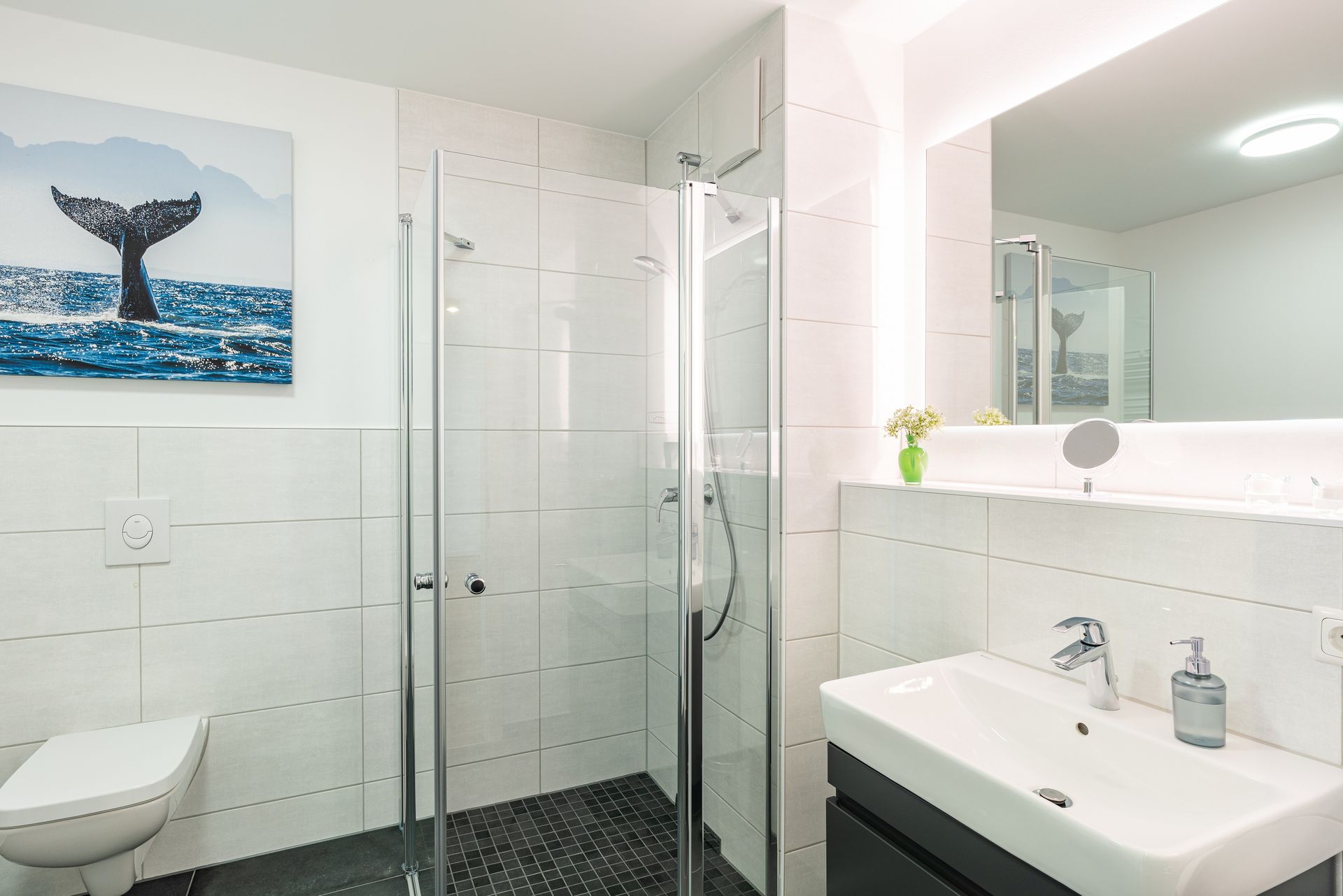 Die beiden vollausgestatteten Badezimmer verfügen jeweils über eine ebenerdige Dusche, WC, Waschtischanlage sowie Fön.