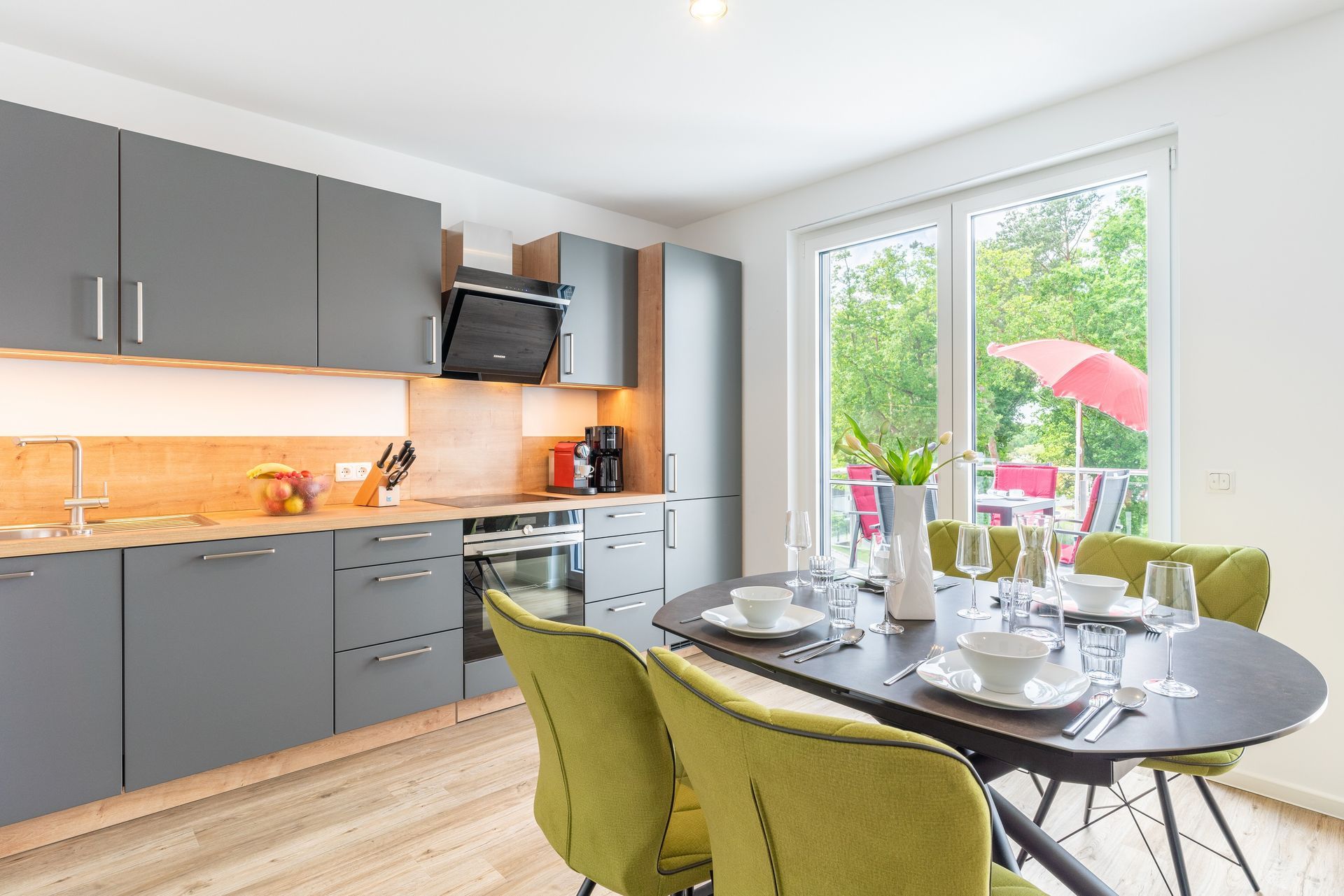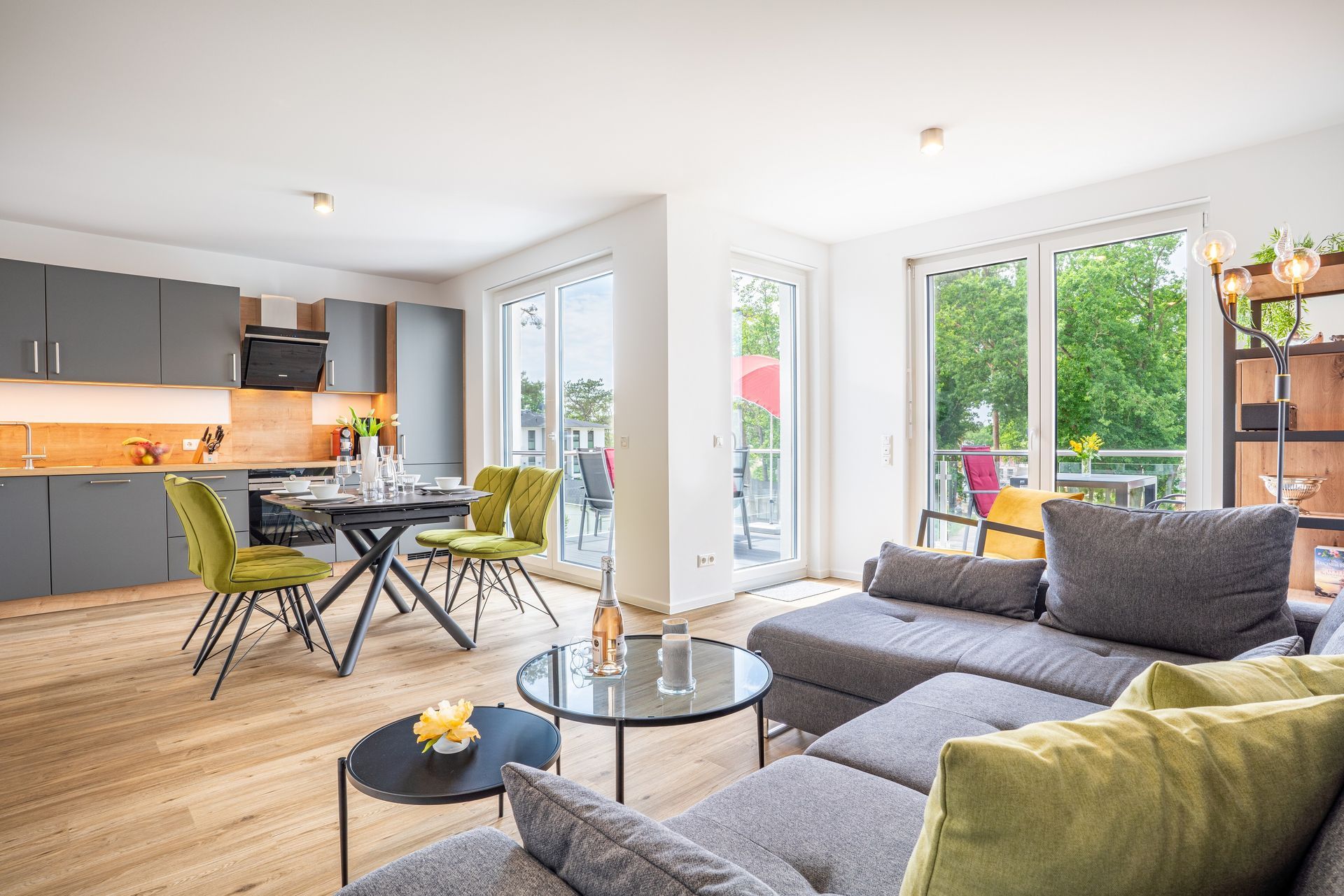 Der offen gestaltete Wohnbereich ist mit einem ausziehbaren Eck-Sofa, Smart-TV sowie einem Internetradio ausgestattet. Sie haben vom Wohnzimmer aus Zugang zum Südwest-Balkon. Der möblierte Balkon mit traumhaften Ausblicken auf das Stettiner Haff bietet auch aus der zweiten Reihe einen wunderschönen Ort, um Ihre Mahlzeiten zu genießen und die Aussicht zu bewundern.