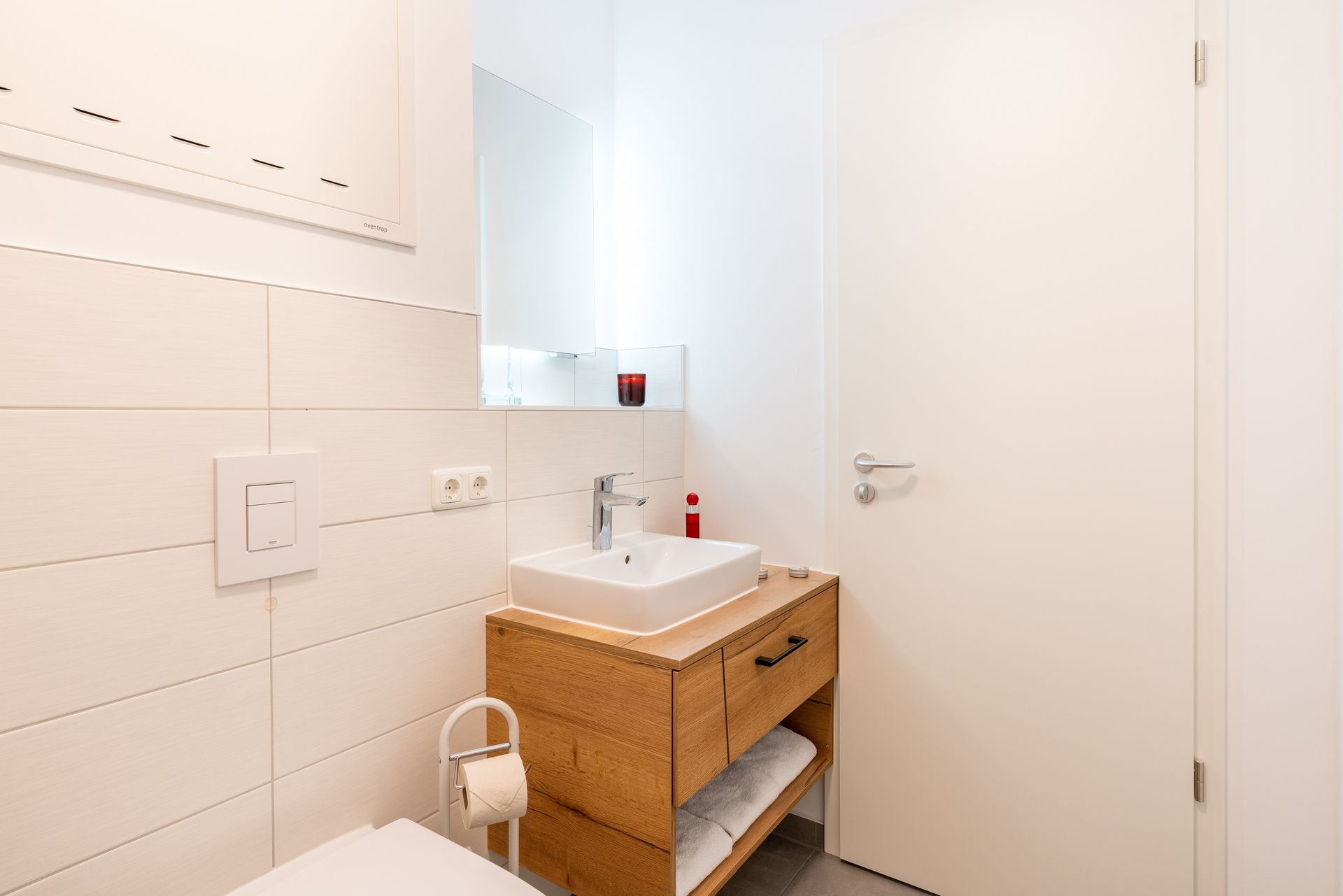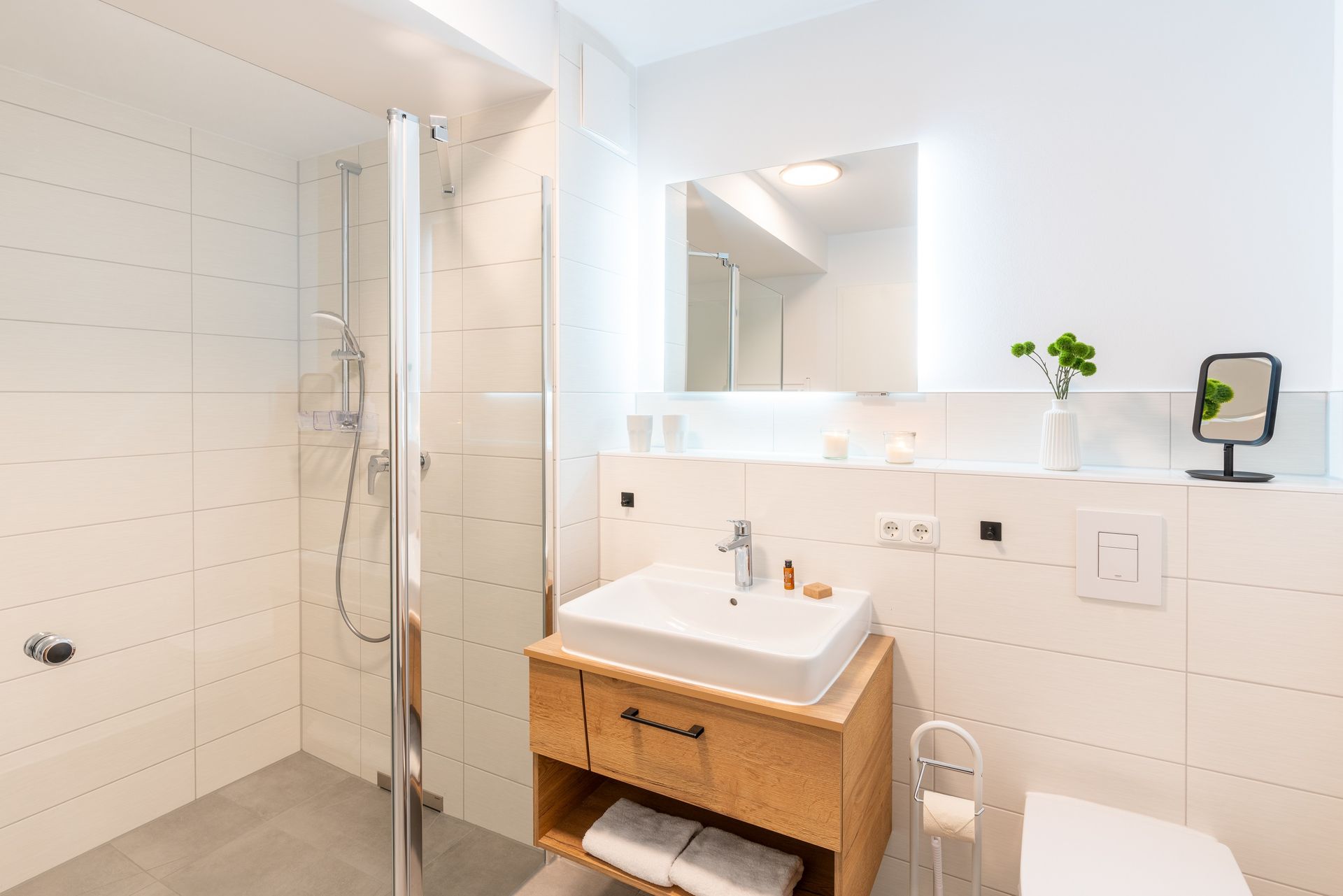 Das vollausgestattete Badezimmer verfügt über eine ebenerdige Dusche, WC, Waschtischanlage sowie Fön. Ihnen steht zudem ein Gäste-WC zur Verfügung.
