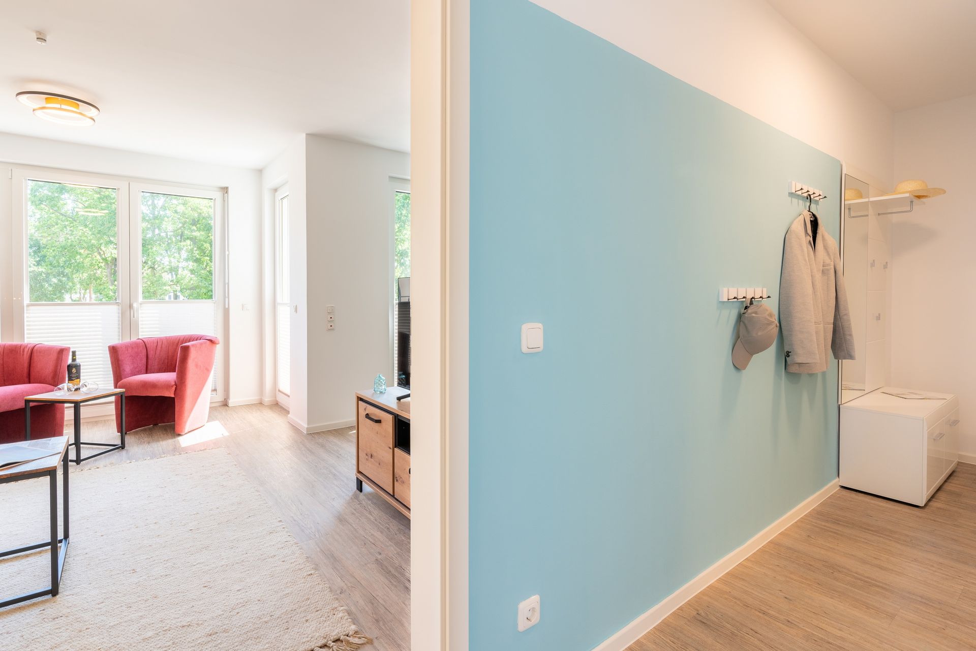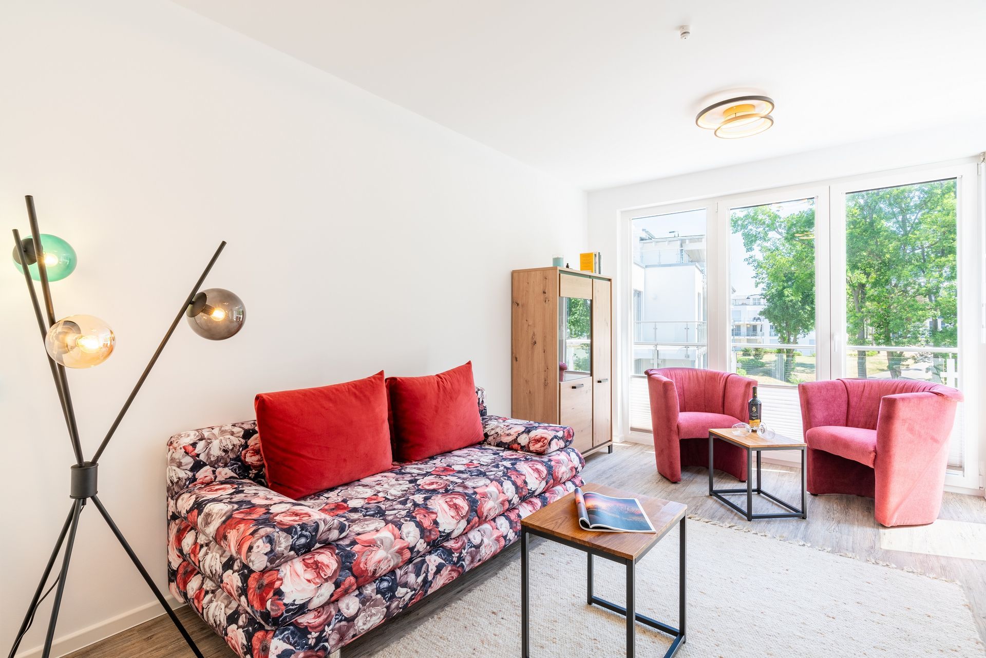 Der offen gestaltete Wohnbereich ist mit einem komfortablen Sofa und zwei Sesseln sowie Smart-TV ausgestattet. Sie haben vom Wohnzimmer aus Zugang zum Südost-Balkon. Der mit Sitzgelegenheiten ausgestattete Balkon bietet mit traumhaften Ausblicken in die Parkanlage einen wunderschönen Ort, um Ihre Mahlzeiten zu genießen und die Aussicht zu bewundern.