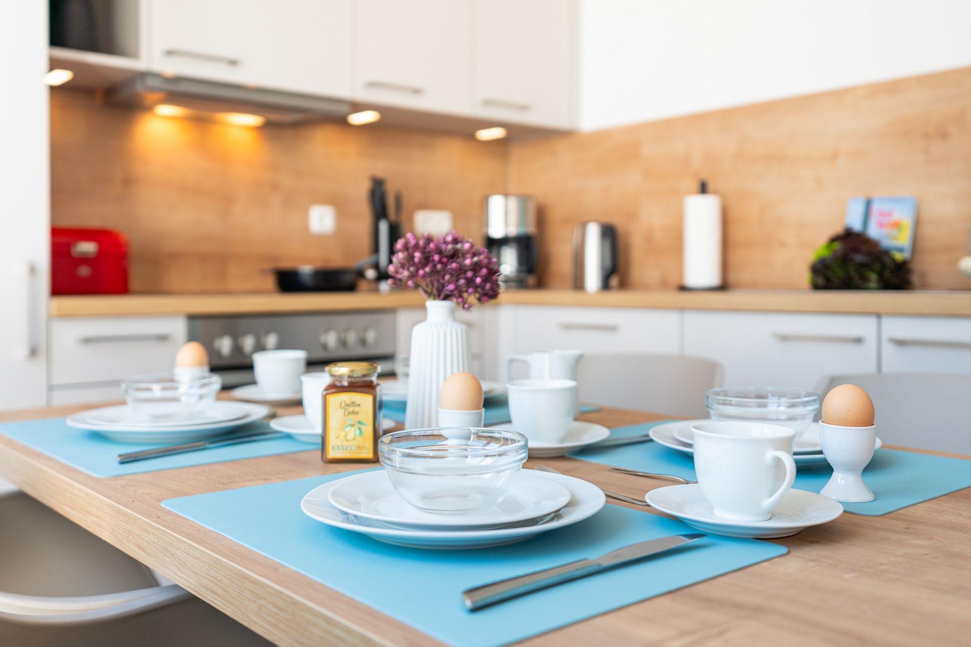Die Küchenzeile verfügt über hochwertige Geräte wie Herd, Backofen, Mikrowelle, Kühl- und Gefrierschrank sowie Spülmaschine. Ausreichend Geschirr, Besteck sowie Töpfe und Pfannen befinden sich in den Schränken. Am großen Esstisch finden Sie vor einem erholsamen Urlaubstag zu einem gemeinsamen Frühstück zusammen.