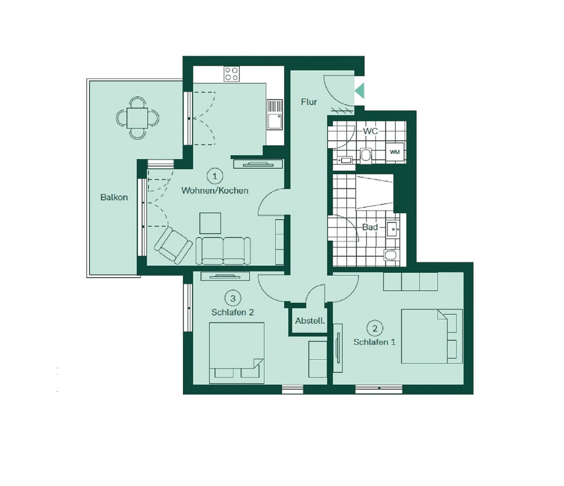 - Wohn- und Schlafräume können mittels Außenjalousien komplett abgedunkelt werden