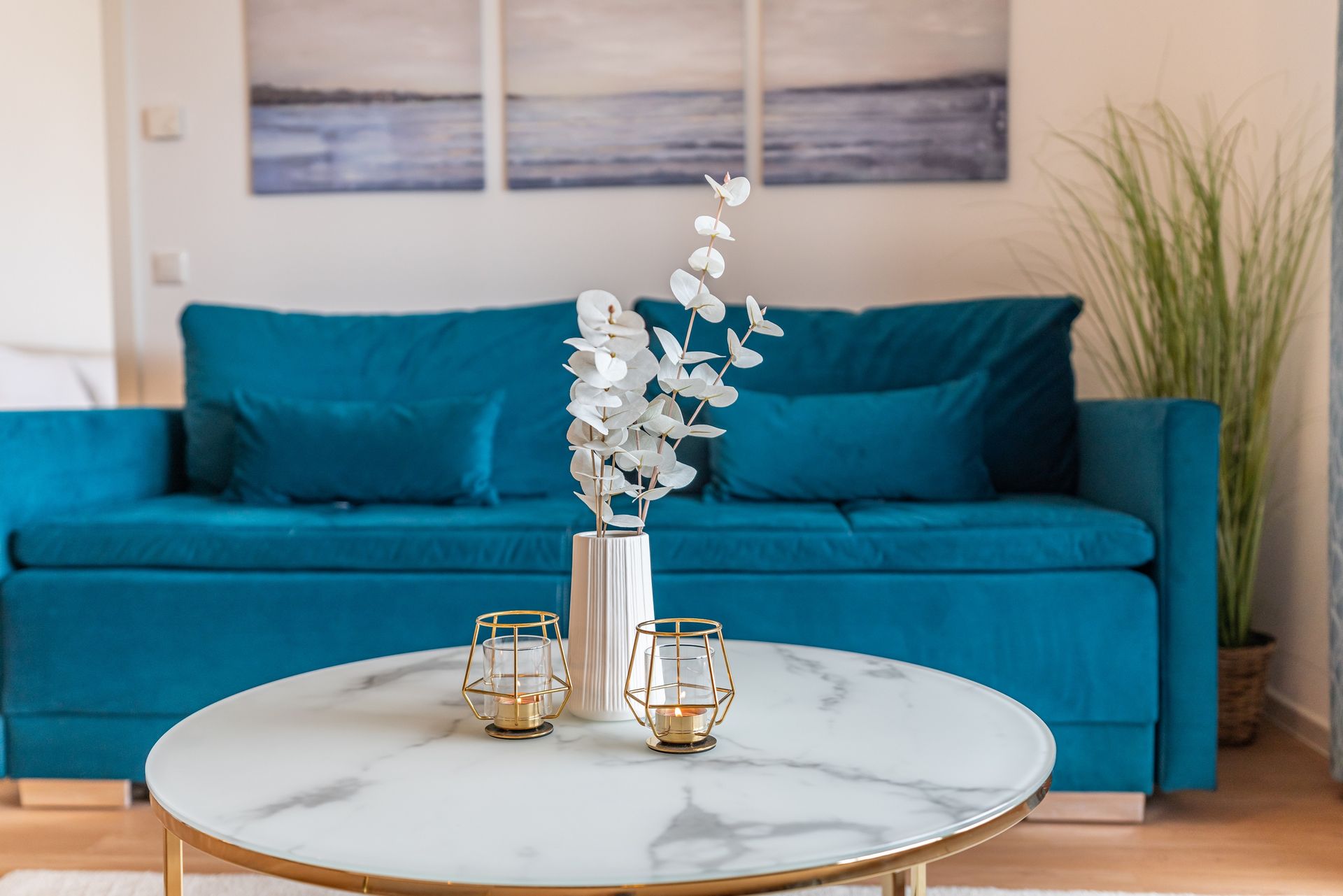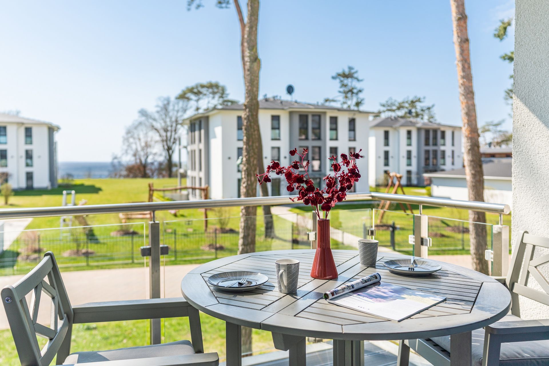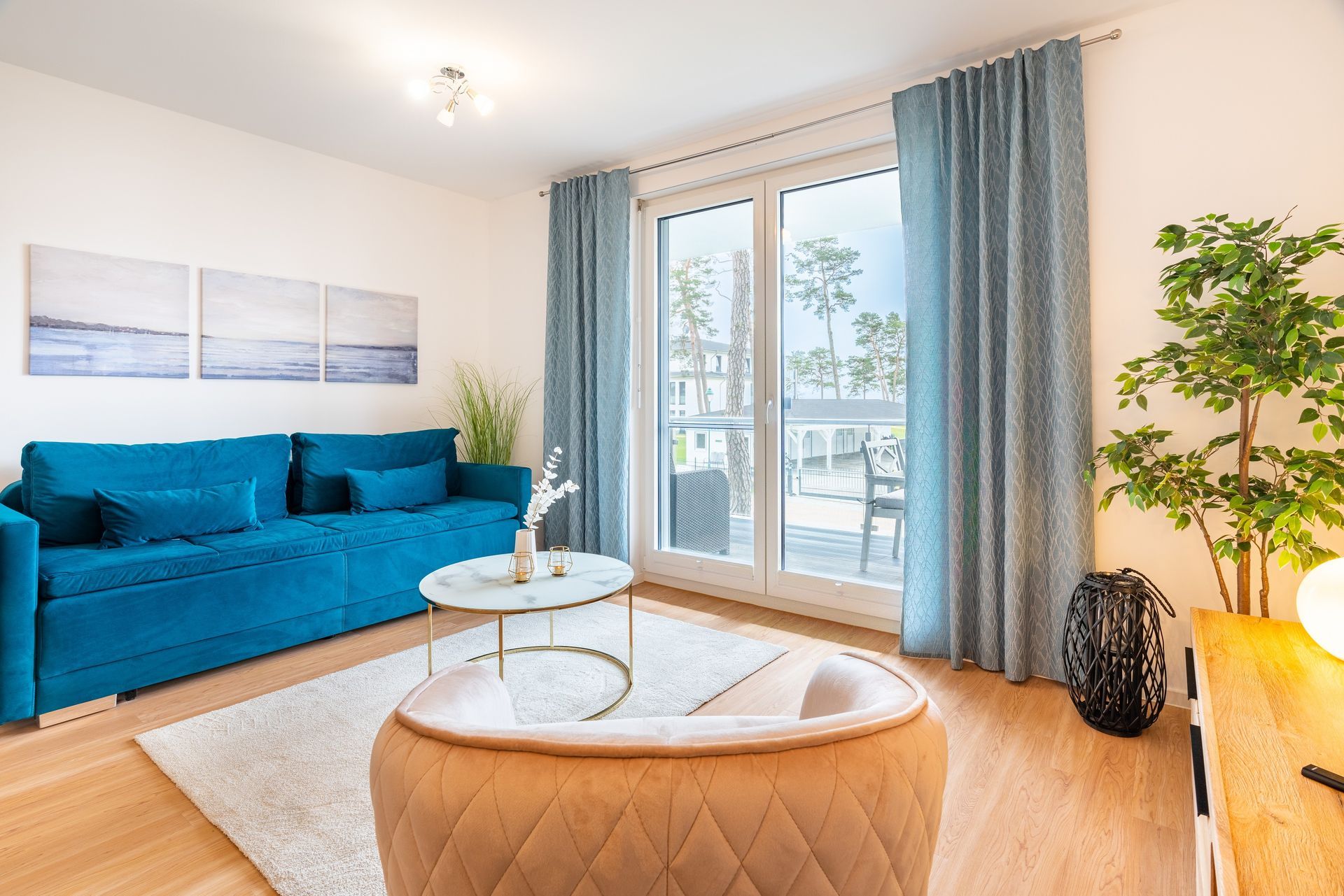 Der offene Wohnbereich ist ausgestattet mit einem gemütlichen Sofa und Smart-TV. Sie haben vom Wohn- und Schlafzimmer aus Zugang zum großen Süd-Balkon. Der möblierte Balkon mit traumhaften Ausblicken auf das Stettiner Haff bietet auch aus der zweiten Reihe einen wunderschönen Ort, um Ihre Mahlzeiten zu genießen und die Aussicht zu bewundern.