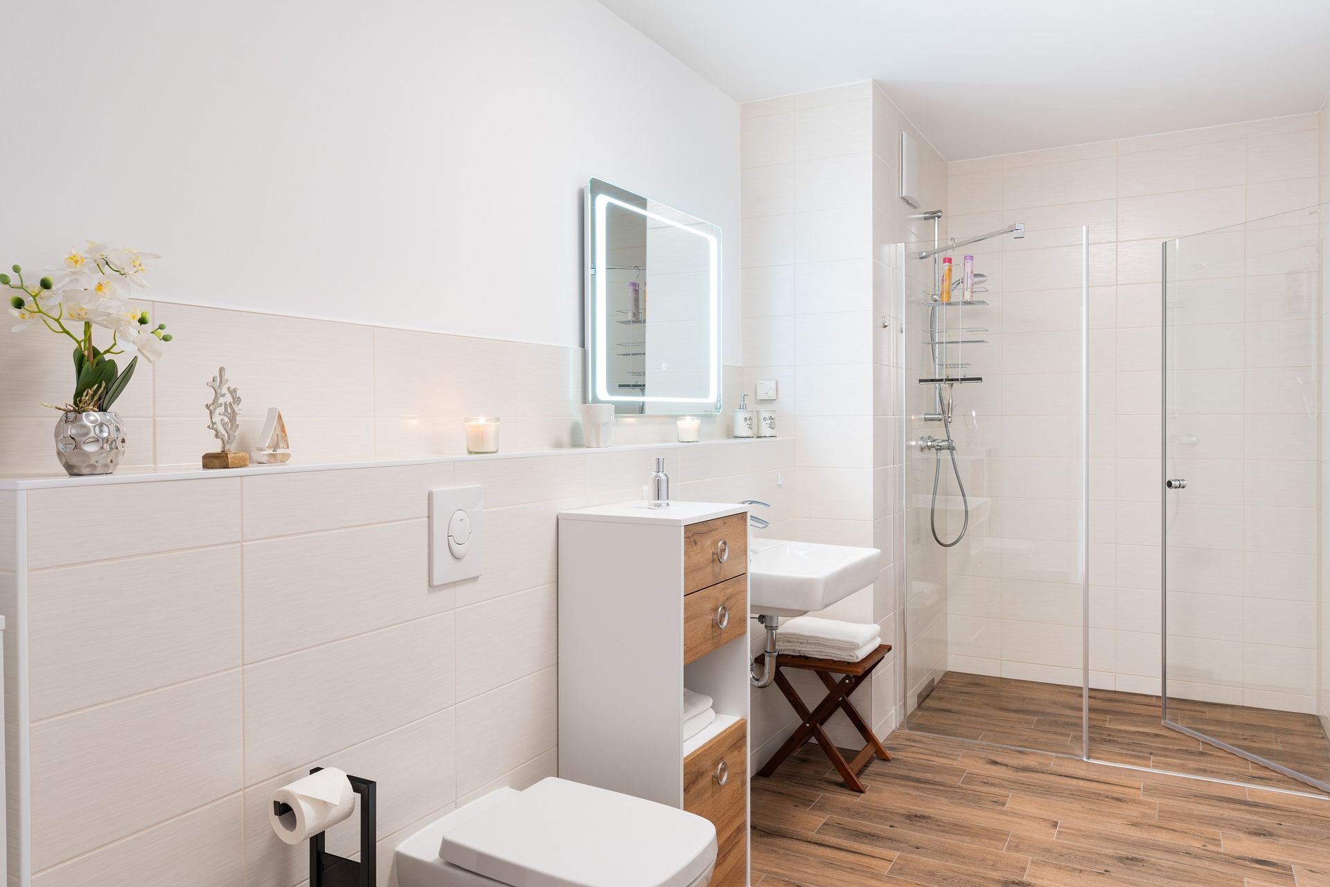 Das Badezimmer ist mit einer ebenerdigen Dusche, WC, Waschtisch und Fön ausgestattet.