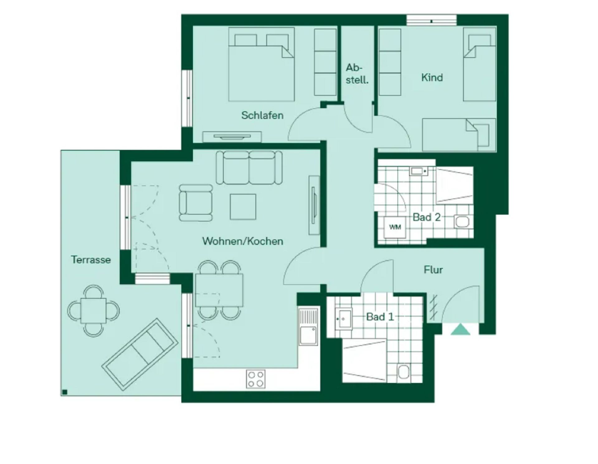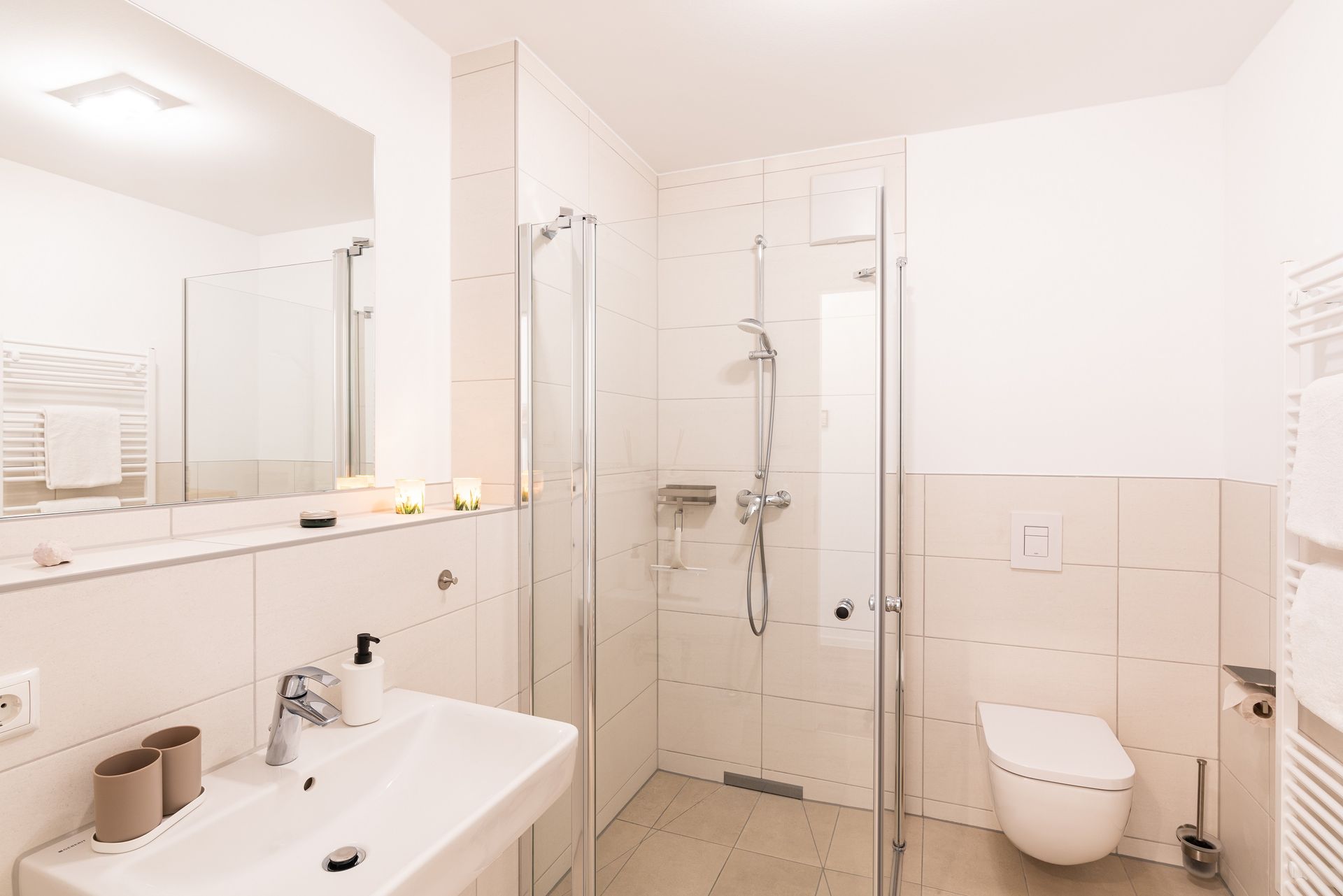 Die beiden vollausgestatteten Badezimmer verfügen jeweils über eine ebenerdige Dusche, WC, Waschtischanlage sowie Fön.