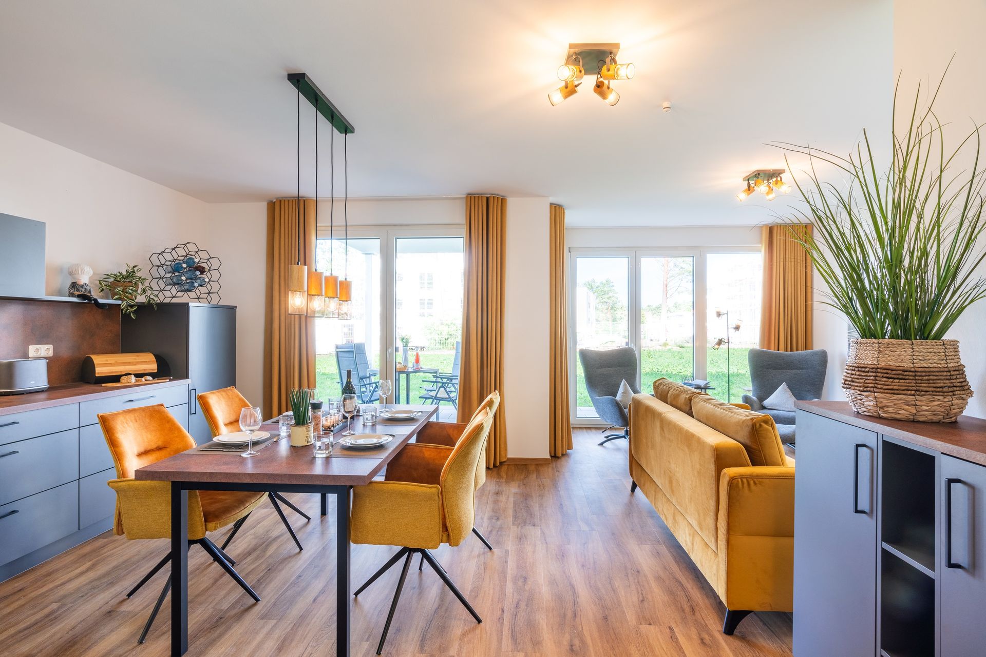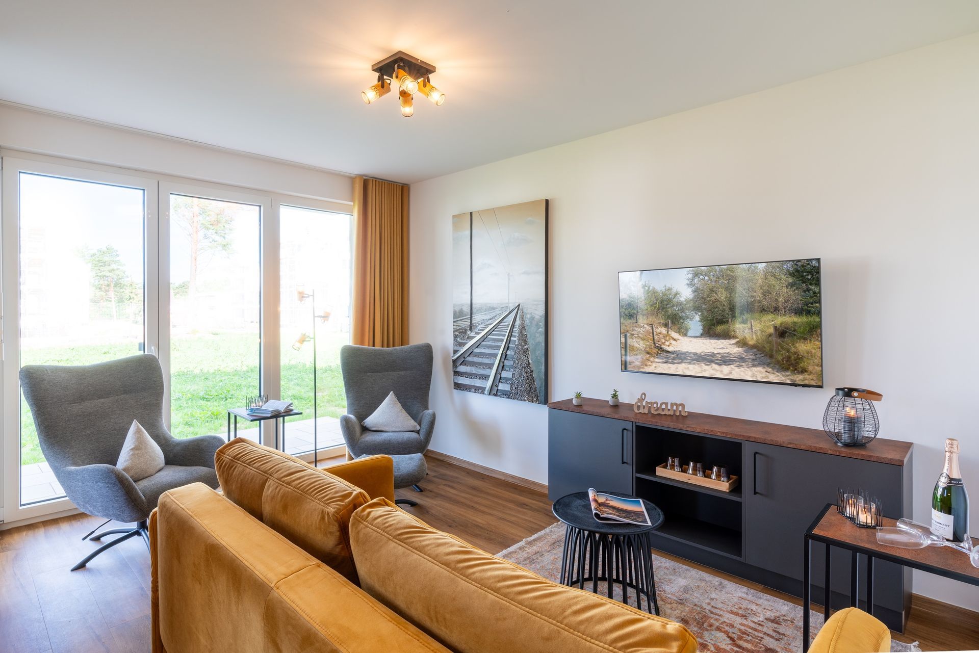 Der offen gestaltete Wohnbereich ist mit einem Sofa, zwei Sesseln mit Fußhockern und Smart-TV ausgestattet. Sie haben vom Wohnzimmer aus Zugang zur Südwest-Terrasse. Genießen Sie Ihre Speisen auf der möblierten Terrasse mit traumhaften Ausblicken in die Gartenanlage.
