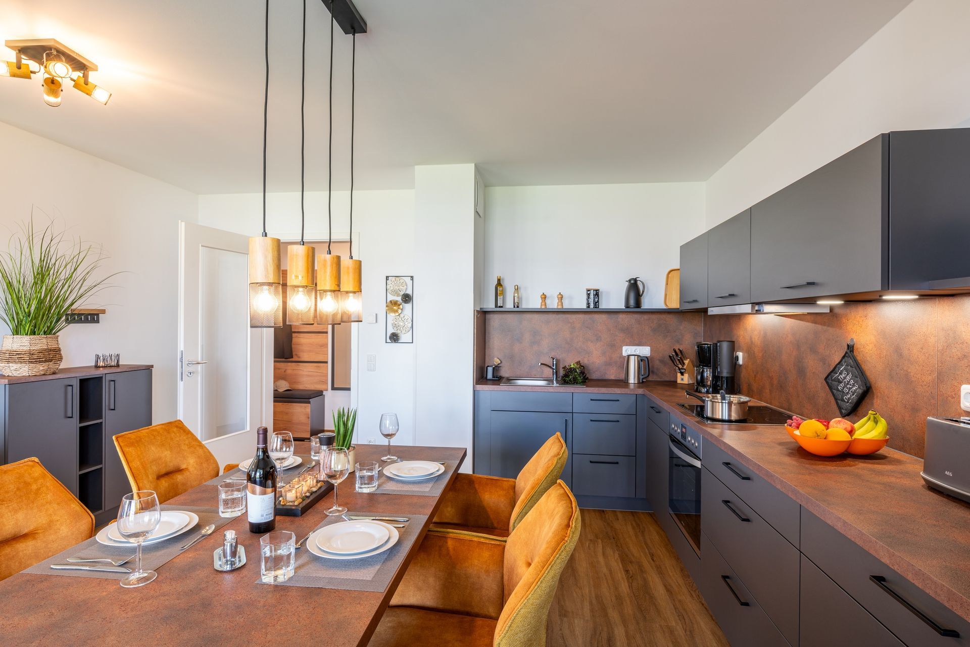 Die Küchenzeile verfügt über hochwertige Geräte wie Herd, Kaffeefiltermaschine, Backofen, Kühlschrank mit Gefrierfach sowie Spülmaschine. Ausreichend Geschirr, Besteck sowie Töpfe und Pfannen befinden sich in den Schränken. Am Esstisch finden Sie vor einem erholsamen Urlaubstag zu einem gemeinsamen Frühstück zusammen.
