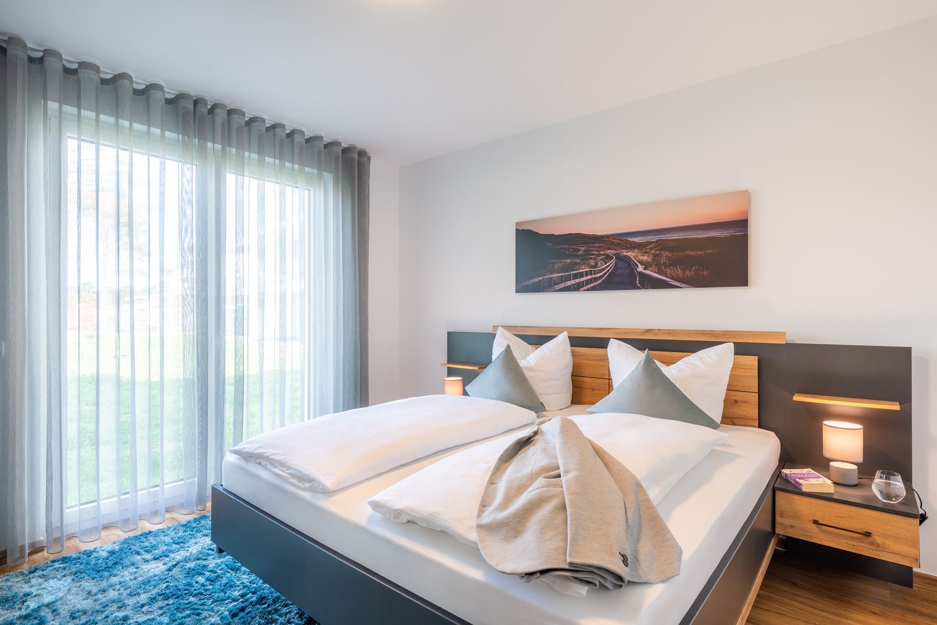 Auf einer Wohnfläche von 70 m² finden drei Erwachsene und ein Kleinkind bis zwei Jahre (im Babybett) in dieser modern eingerichteten Ferienwohnung ausreichend Platz für einen entspannten Urlaub am Stettiner Haff auf Usedom.