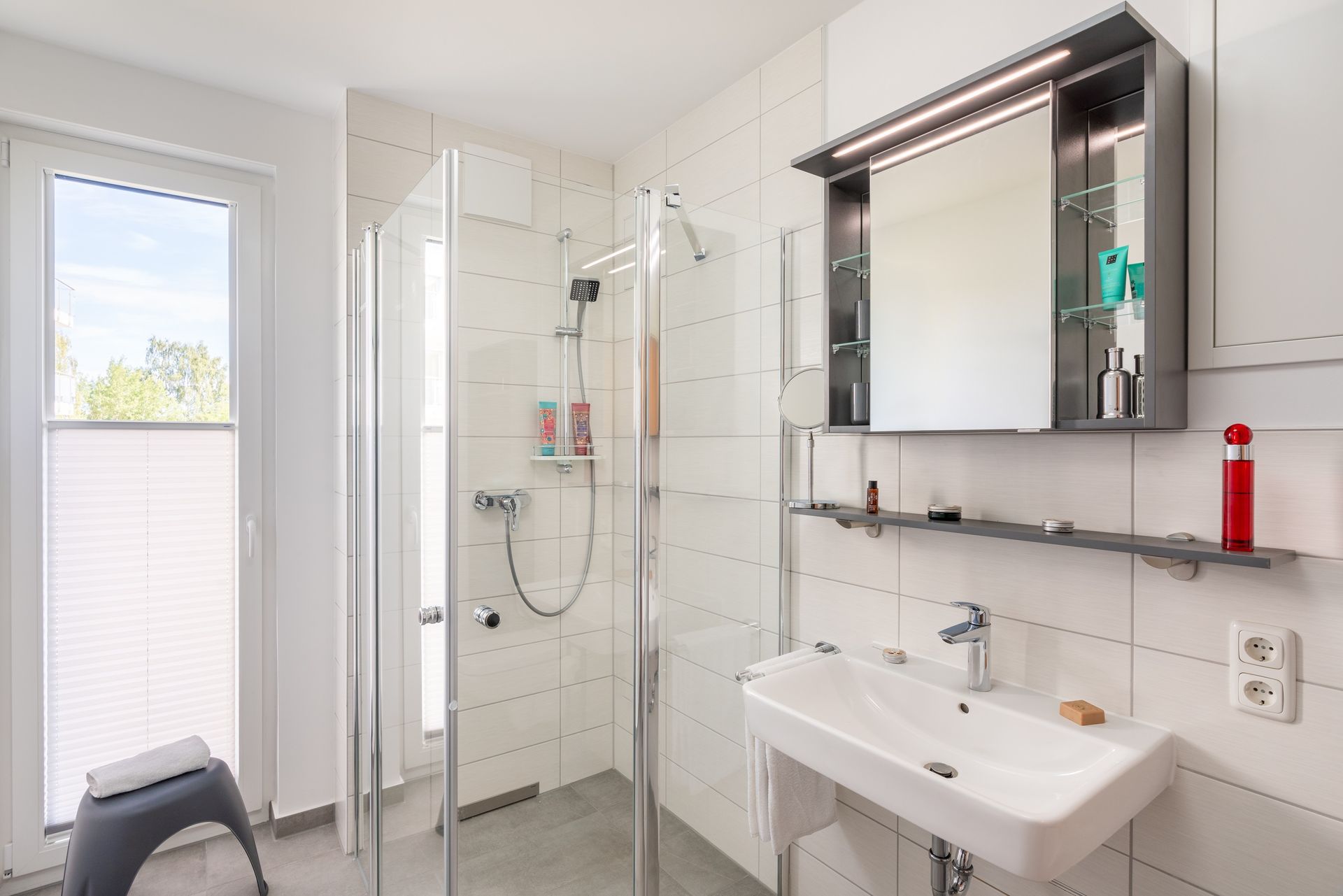 Das vollausgestattete Badezimmer verfügt über eine ebenerdige Dusche, WC, Waschtischanlage sowie Fön.