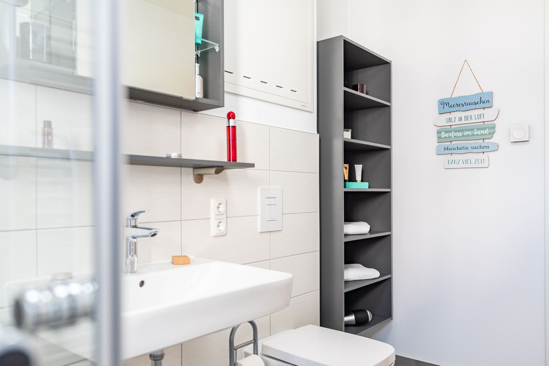 Informationen für Gäste mit Mobilitätseinschränkung: Der Zugang vom Parkplatz zum Hauseingang ist barrierefrei. Die Distanz vom Parkplatz zur Haustür beträgt etwa 30 Meter. Die Breite der Haustür beträgt 100 cm. Die Dichtigkeitsschwelle der Haustür ist etwa 1,5 cm hoch. Der Aufzug im Treppenhaus fährt jede Etage, auch die Saunalandschaft im Obergeschoss, an. Die Türbreite des Aufzugs beträgt 90 cm, die Tiefe beträgt 130 cm. Die Wohnungstür weist eine Breite von 90 cm auf. Die Breiten der Zimmertüren liegen bei 80 cm (Ausnahme: Türbreite von der Abstellkammer beträgt 70 cm). Im Badezimmer beträgt die Breite der Duschtür etwa 75 cm, die Dichtigkeitsschwelle ist etwa 0,5 cm hoch. Die Duschkabine hat eine Maße von 100 x 100 cm. Auf Wunsch kann ein Duschhocker kostenfrei zur Verfügung gestellt werden. Der Waschtisch ist unterfahrbar. Haltegriffe sind nicht vorhanden. Das Bett weist eine Höhe von 60 cm auf und ist unterfahrbar (max. 15 cm). Die Terrassentür ist zweiflügelig und weist eine Schwelle von etwa 15 cm auf (nicht barrierefrei). Das an der Terrassentür befindliche Fliegengitterschiebeelement lässt die Balkontür auf eine Breite von etwa 70 cm öffnen. Die Schwelle von der gepflasterten Terrasse zur Rasenkante beträgt etwa 15 cm. Der Saunabereich im Dachgeschoss ist mit dem Aufzug erreichbar. Im Dachgeschoss ist eine Sauna mit dem Rollstuhl befahrbar, die Türbreite beträgt 90 cm. Für das Betreten der Dachterrassen müssen zwei Stufen passiert werden. Das Betreten des Südbalkons im Dachgeschoss ist barrierefrei möglich. Die Freizeitbereiche im Untergeschoss des Nachbarhauses sind komplett barrierefrei gestaltet. Die Türbreiten liegen bei 90 cm.