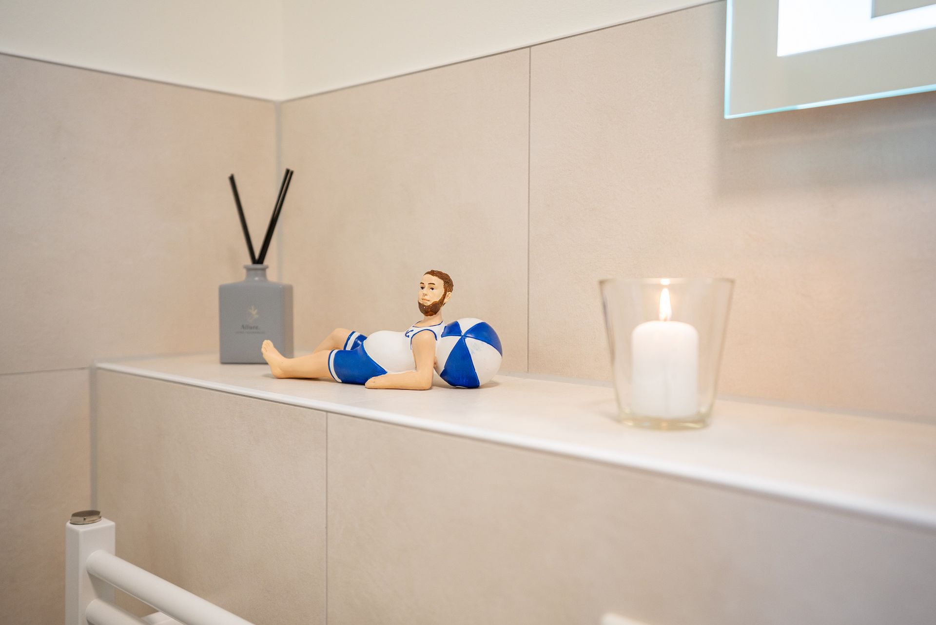 Informationen für Gäste mit Mobilitätseinschränkung: Der Zugang vom Parkplatz zum Hauseingang ist barrierefrei. Die Breite der Haustür beträgt 100 cm. Die Dichtigkeitsschwelle der Haustür ist etwa 1,5 cm hoch. Der Aufzug im Treppenhaus fährt jede Etage, somit auch die Freizeitbereiche im Untergeschoss als auch die Saunalandschaft im Obergeschoss, an. Die Türbreite des Aufzugs beträgt 90 cm, die Tiefe beträgt 130 cm. Die Wohnungstür weist eine Breite von 90 cm auf. Die Breiten der Zimmertüren liegen bei 80 cm (Ausnahme: Türbreite vom kleinen Badezimmer und Abstellkammer beträgt 70 cm). Im großen Badezimmer gibt es eine Duschabtrennung. Die Breite des Duscheinstiegs beträgt 70 cm, die Breite der Dusche beträgt 120 cm. Auf Wunsch kann ein Duschhocker kostenfrei zur Verfügung gestellt werden. Im kleinen Badezimmer beträgt die Breite der Dusche 60 cm. Die Dichtigkeitsschwelle ist etwa 0,5 cm hoch. Die Waschtische sind in beiden Bädern unterfahrbar. Haltegriffe sind nicht vorhanden. Die Betten weisen eine Höhe von 60 cm auf und sind unterfahrbar (max. 25 cm). Die Terrassentür ist zweiflügelig und weist eine Schwelle von etwa 0,5 cm auf. Die Schwelle von der gepflasterten Terrasse zur Rasenkante beträgt etwa 15 cm. Die Freizeitbereiche im Untergeschoss sind komplett barrierefrei gestaltet. Die Türbreiten liegen bei 90 cm. Im Dachgeschoss ist eine Sauna mit dem Rollstuhl befahrbar, die Türbreite beträgt 90 cm. Für das Betreten der Dachterrassen müssen zwei Stufen passiert werden.