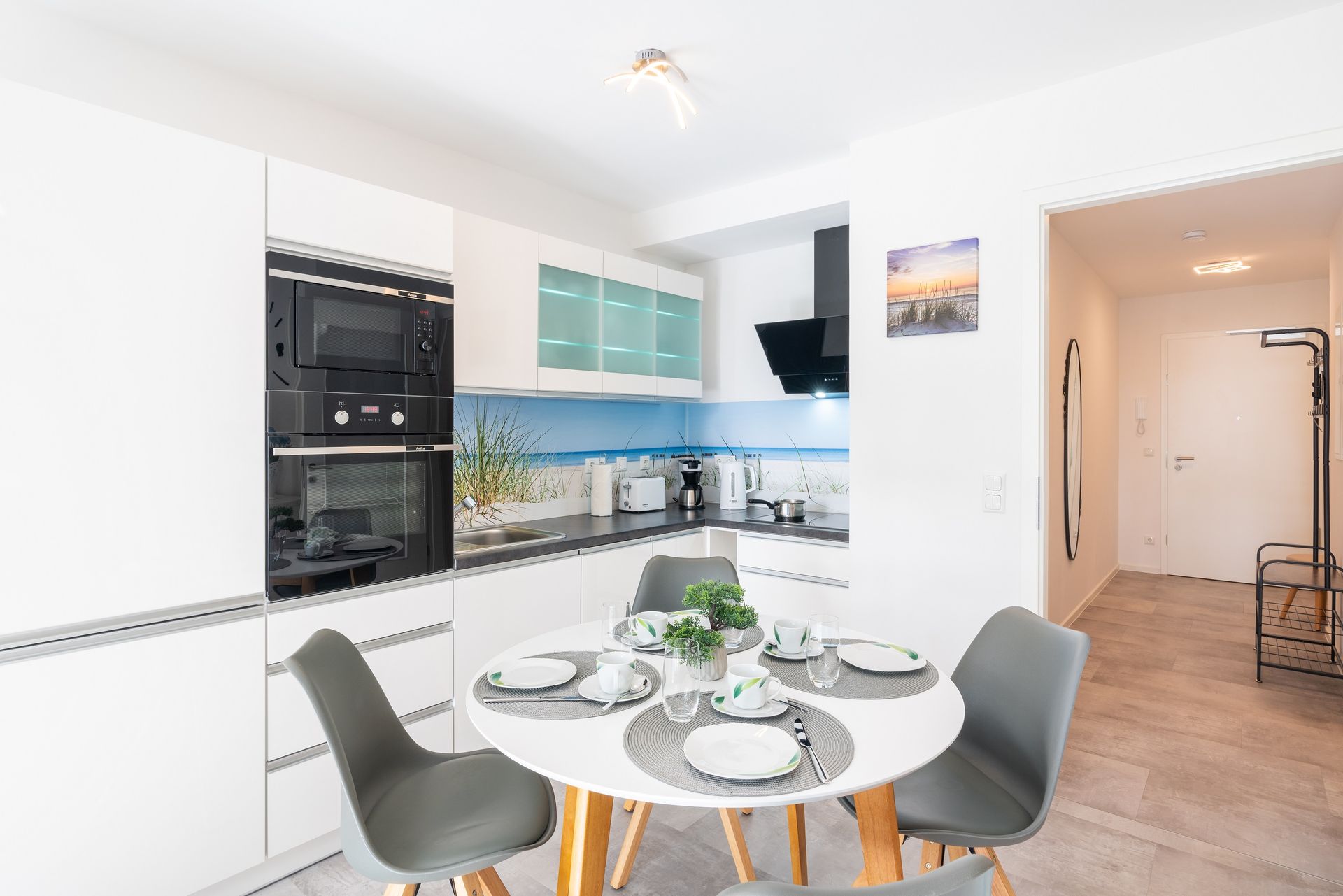 Die Küchenzeile verfügt über hochwertige Geräte wie Herd, Kaffeemaschine, Backofen, Eierkocher, Kühl- und Gefrierschrank sowie Spülmaschine. Ausreichend Geschirr, Besteck sowie Töpfe und Pfannen befinden sich in den Schränken. Am Esstisch finden Sie vor einem erholsamen Urlaubstag zu einem gemeinsamen Frühstück zusammen.