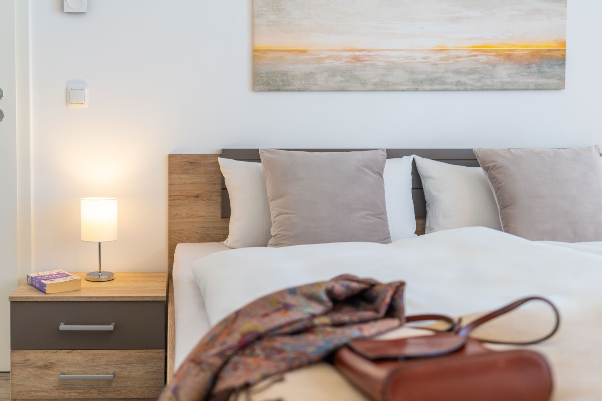 Erholsamer Schlaf ist im hochwertigen Doppelbett (180 x 200 cm) garantiert. Das Schlafsofa im Wohnzimmer kann im Handumdrehen zu einem Bett umfunktioniert werden (Liegefläche: 160 x 200 cm).