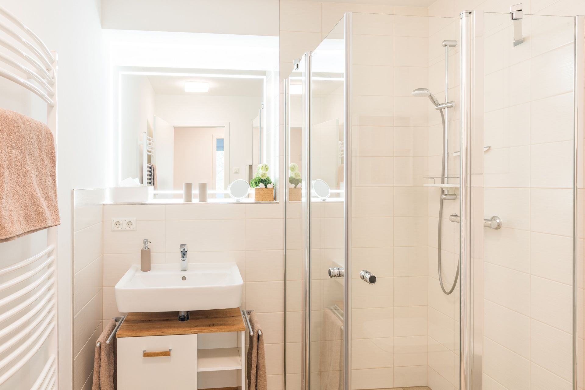 Das vollausgestattete Badezimmer verfügt über einen beheizbaren Handtuchhalter, ebenerdige Regendusche, WC, Waschtischanlage sowie Haartrockner. Ein Marken-Waschtrockner zur kostenfreien Nutzung komplettiert die Ferienunterkunft.